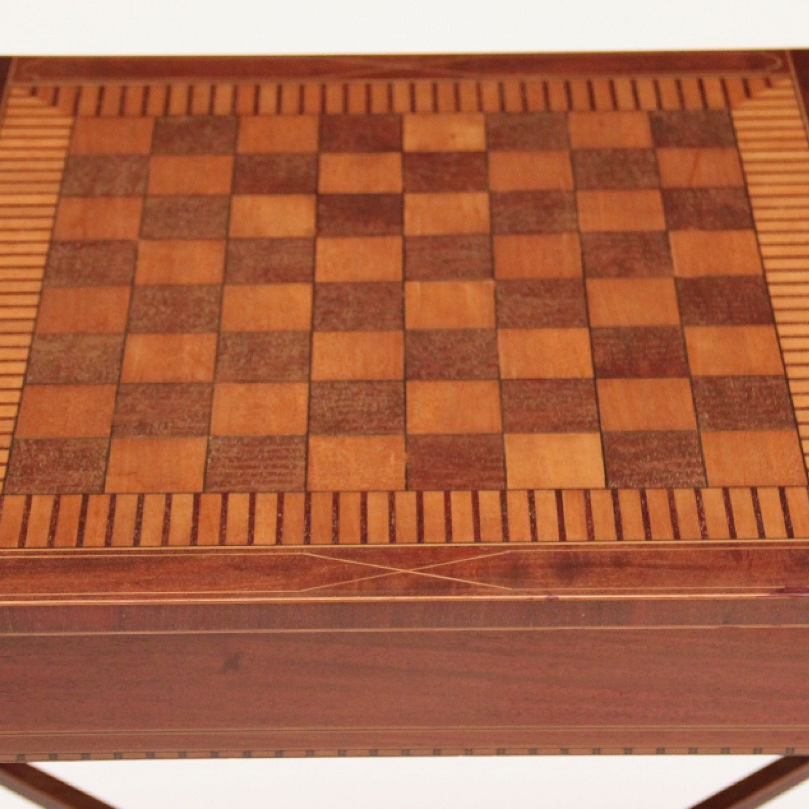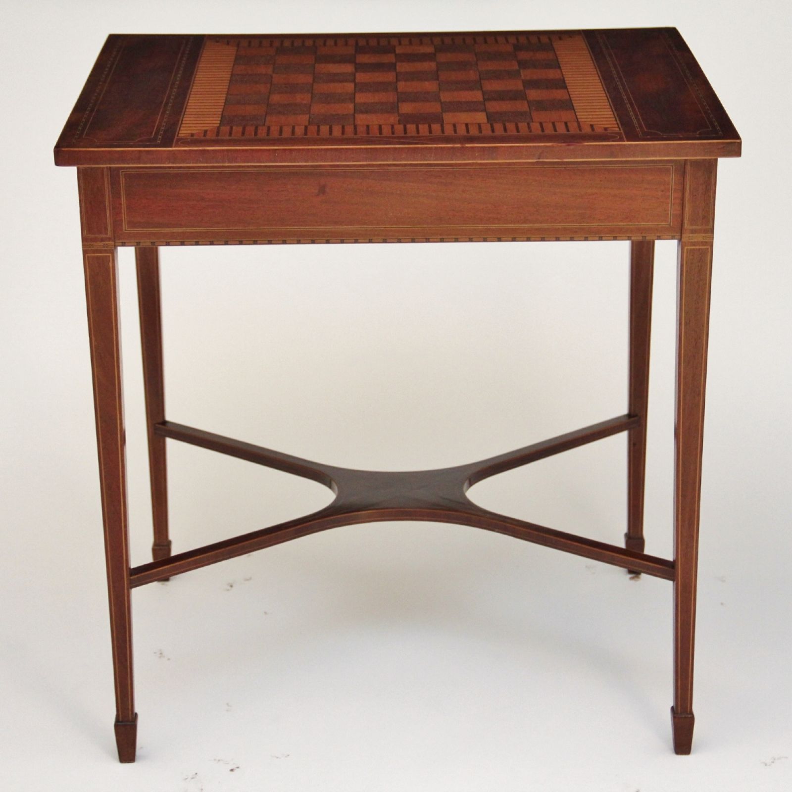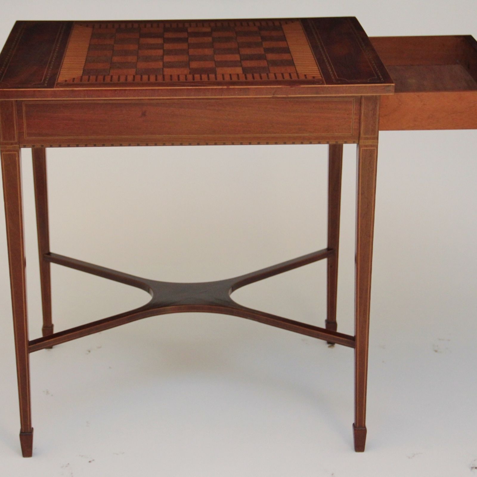 The rectangular chessboard inlaid top above a line inlaid frieze with single frieze drawer, standing on tapering legs with spade feet united with stretchers.