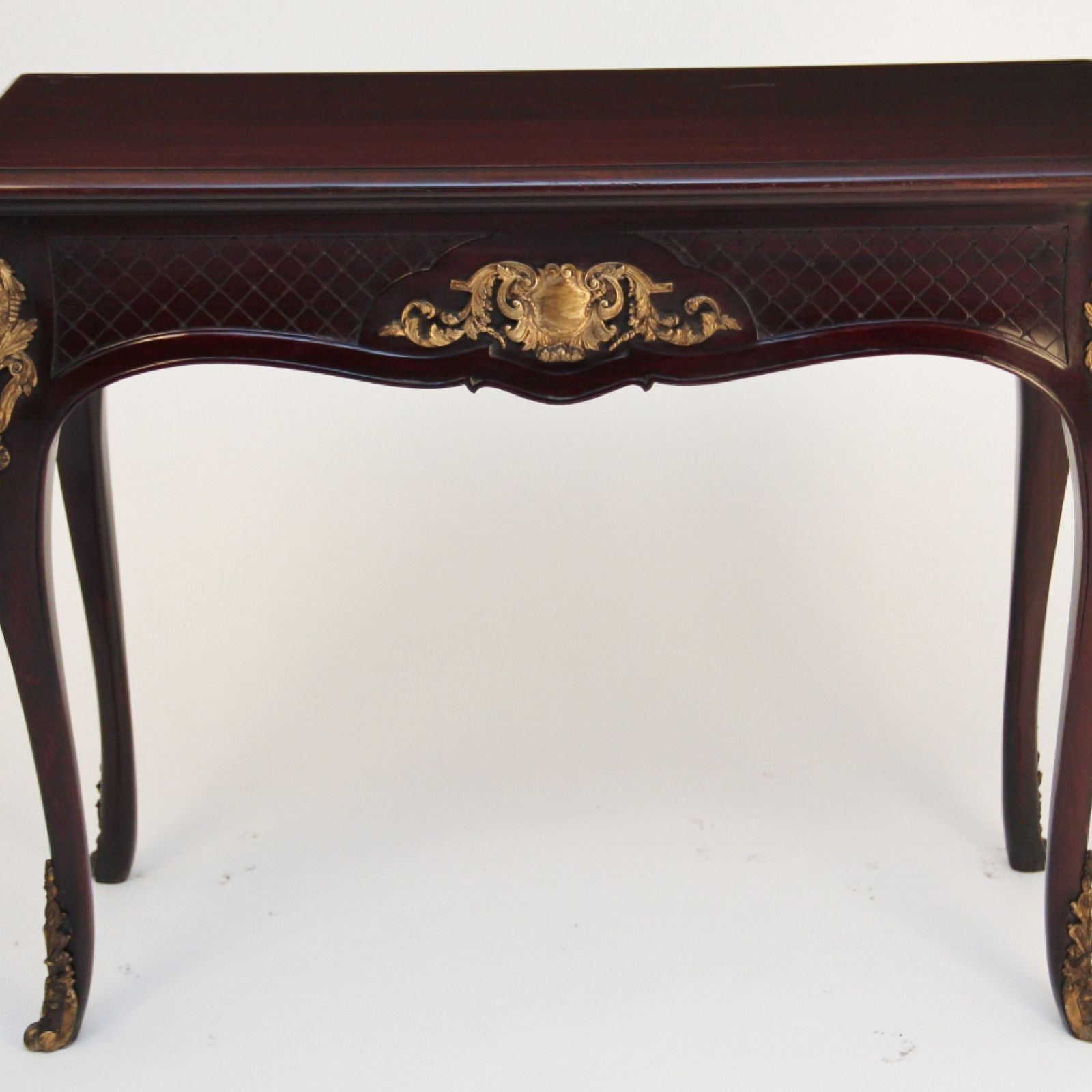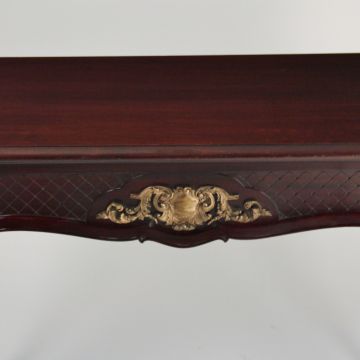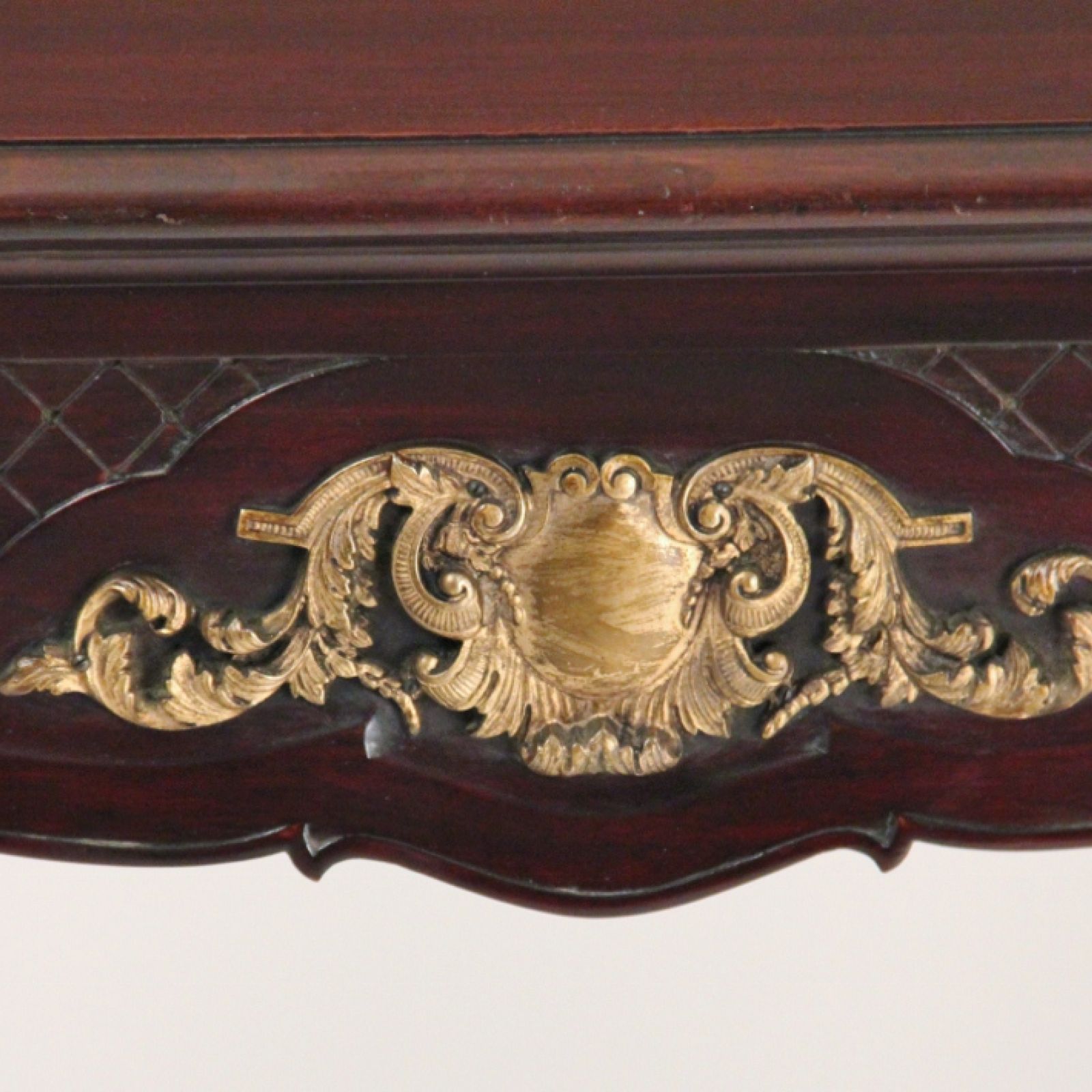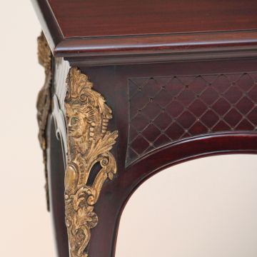 19th Century ormolu mounted mahogany centre table, the moulded rectangular top above a carved frieze centred with gilt metal applique, standing on gilt metal mounted serpentine legs. Underside inscribed "C.Lazarus&Co.LD,Calcutta".