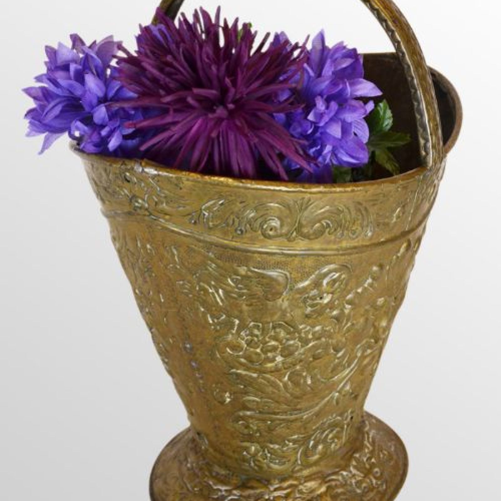 Standing over a wide base the piece rises to a boat shaped top with fixed over-handle. The brass depicts mythical beasts and floral patterns.