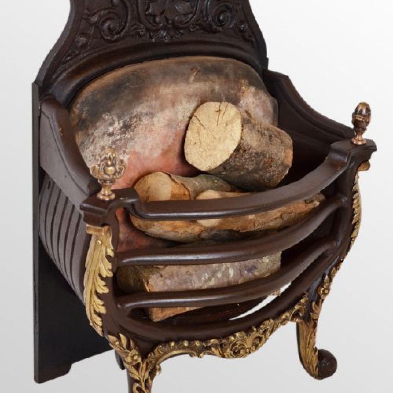 The gorgeous bulbous form with floral detailing in the rear casting is accented by the brass finials and the wonderful brass casting embellishments applied to the sweeping front and legs.