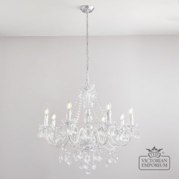 Our ceiling chandeliers vary in size and you will find one suitable for your room size and height by browsing through the styles available. The beauty of the chandelier is enhanced by use of glass and crystal trimmings that are produced in rich variety of shapes such as octagon heads, arrows, tubes, pendeloques, beads, grapes and ovals. These products will arrive flat packed for self-assembly. Ceiling Chandeliers are not suitable for use in a bathroom and should be installed by a suitably qualified person.