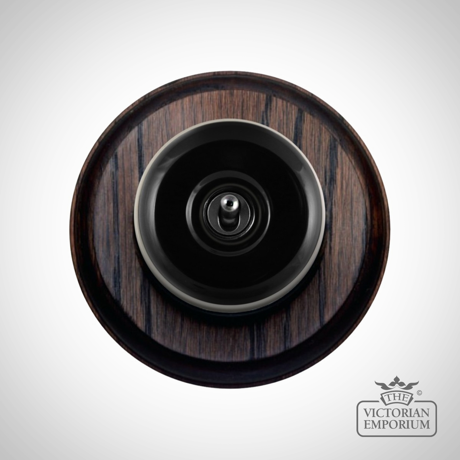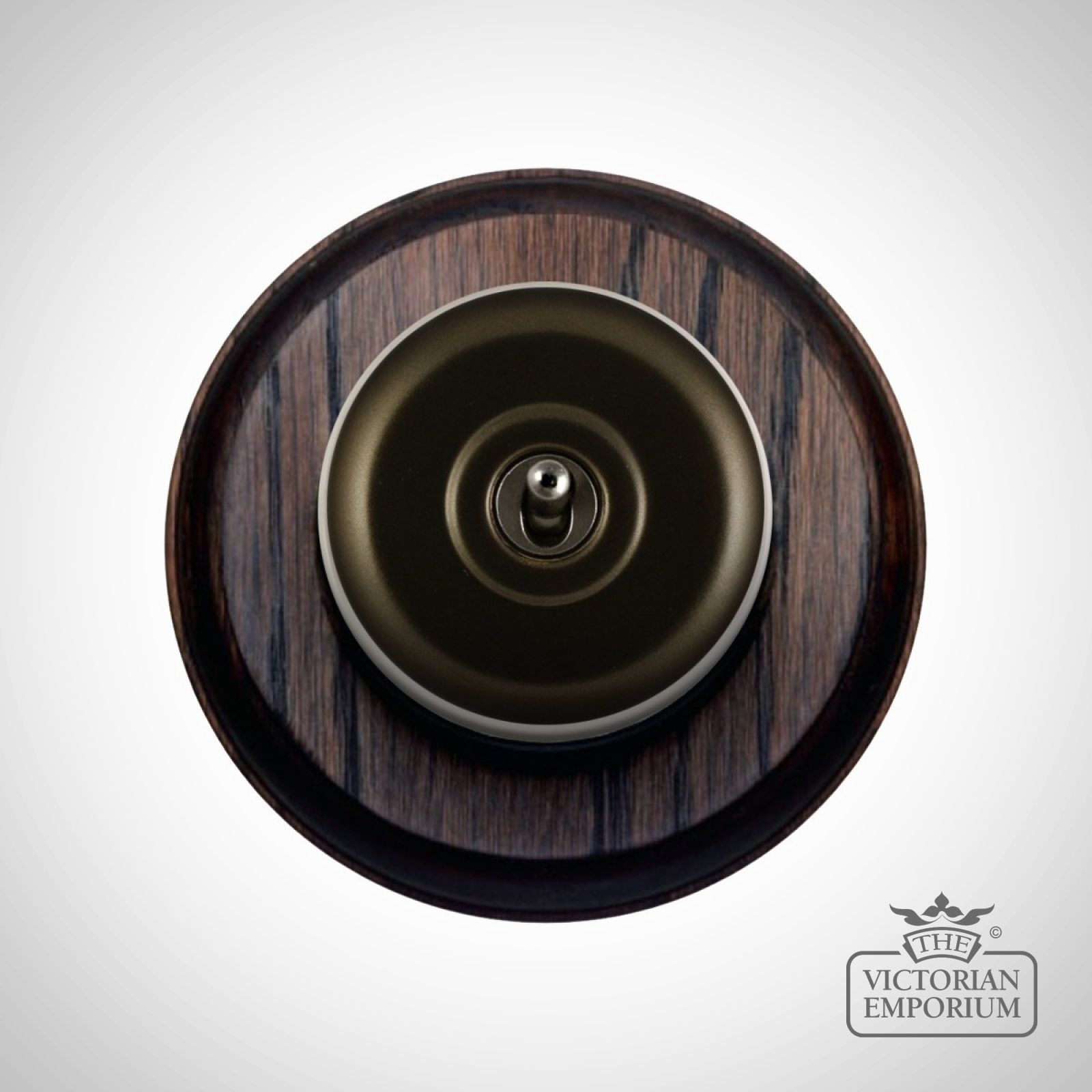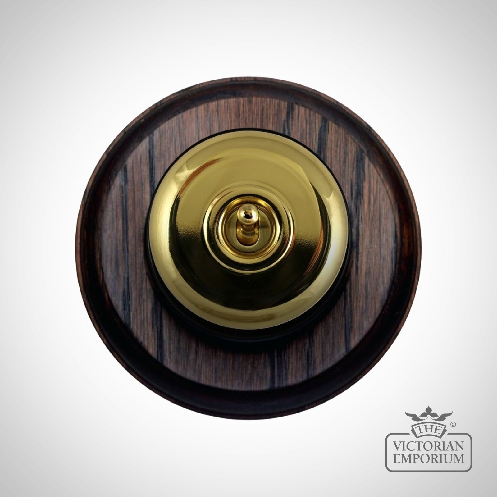 These are reproduced from original light switches from around 1900. The brass domes are hand finished and have oak pattresses. They are designed to meet all current safety standards with modern wiring.