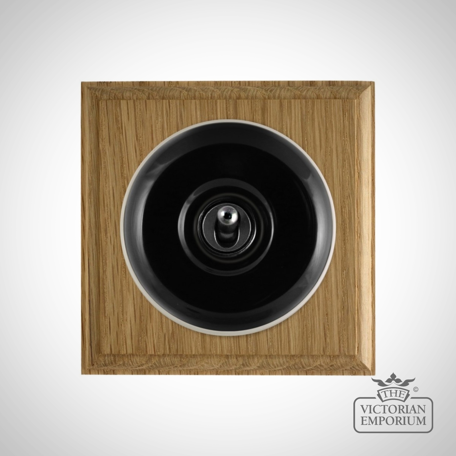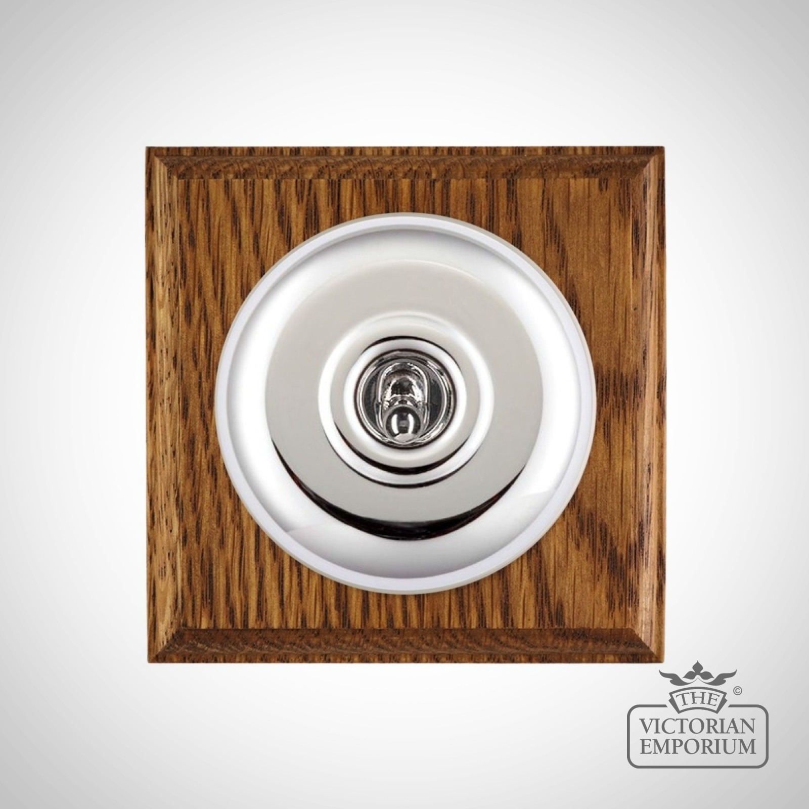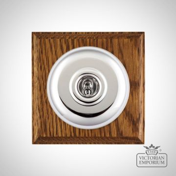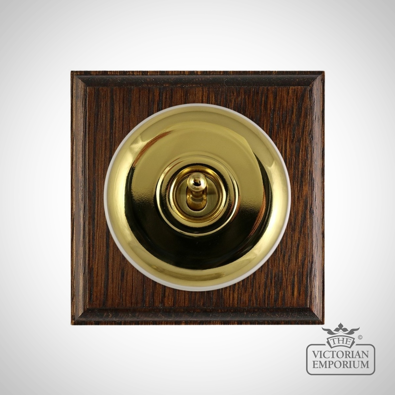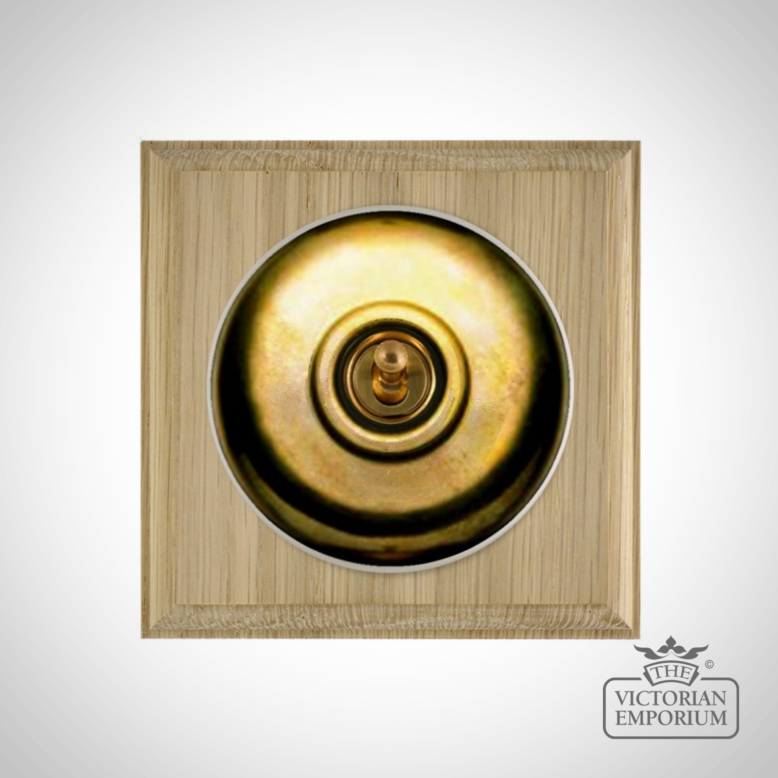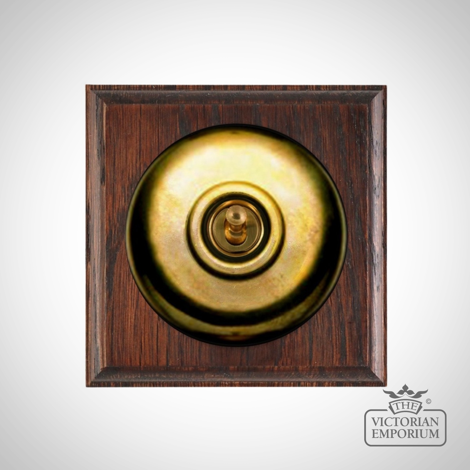 These are reproduced from original light switches from around 1900. The brass domes are hand finished and have oak pattresses.