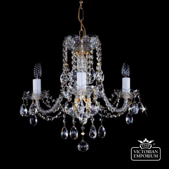 Beautiful small 30% PbO bohemian (3 arm) crystal chandelier with rope twist glass arms, ornate glass bobeches and white glass candle holders