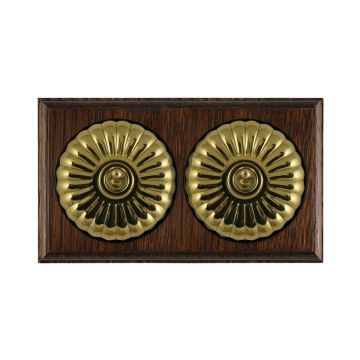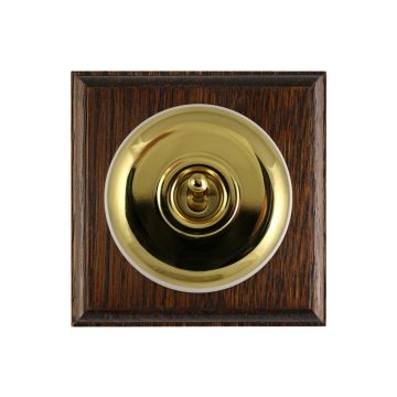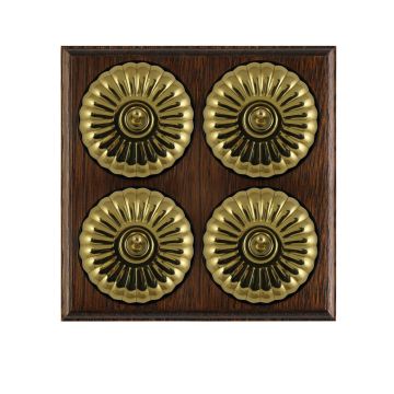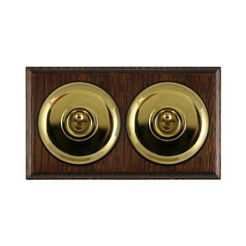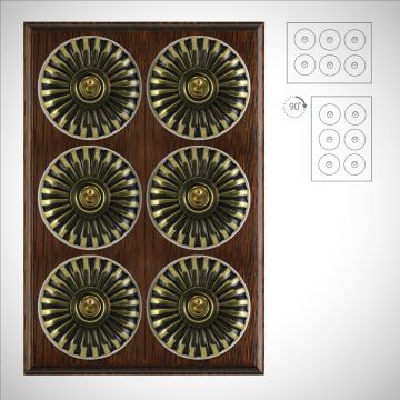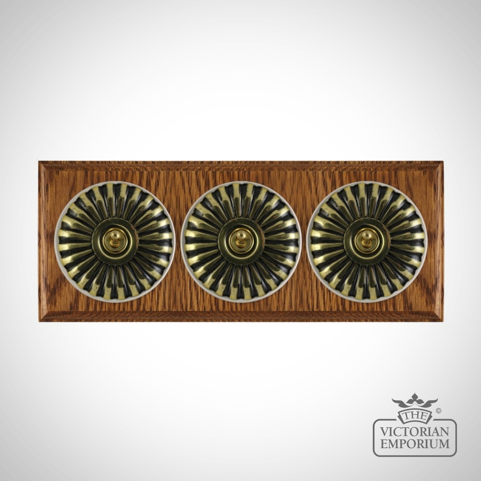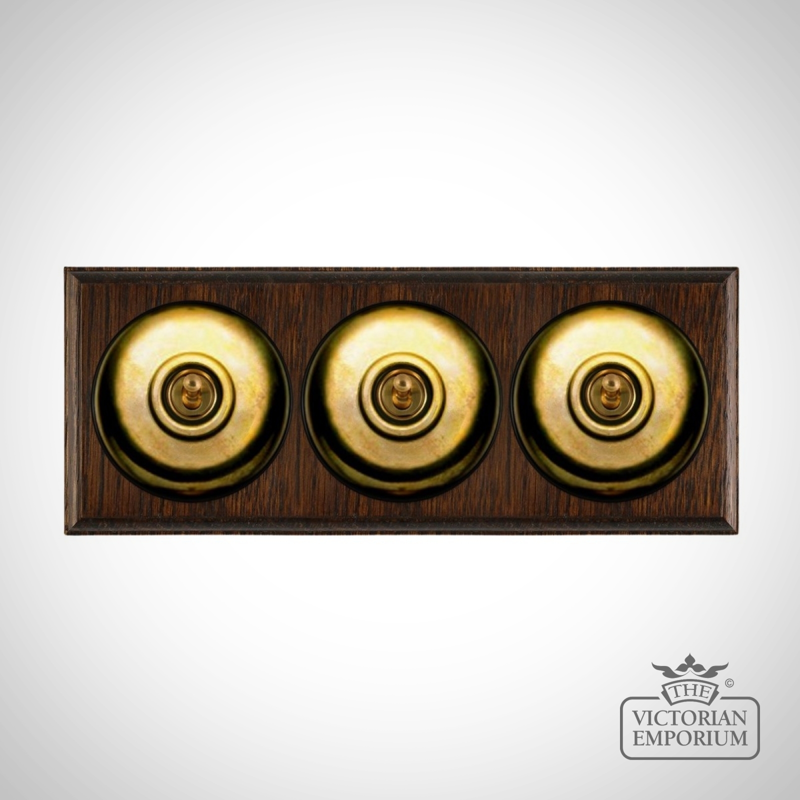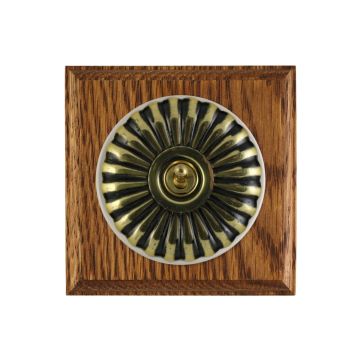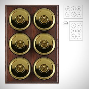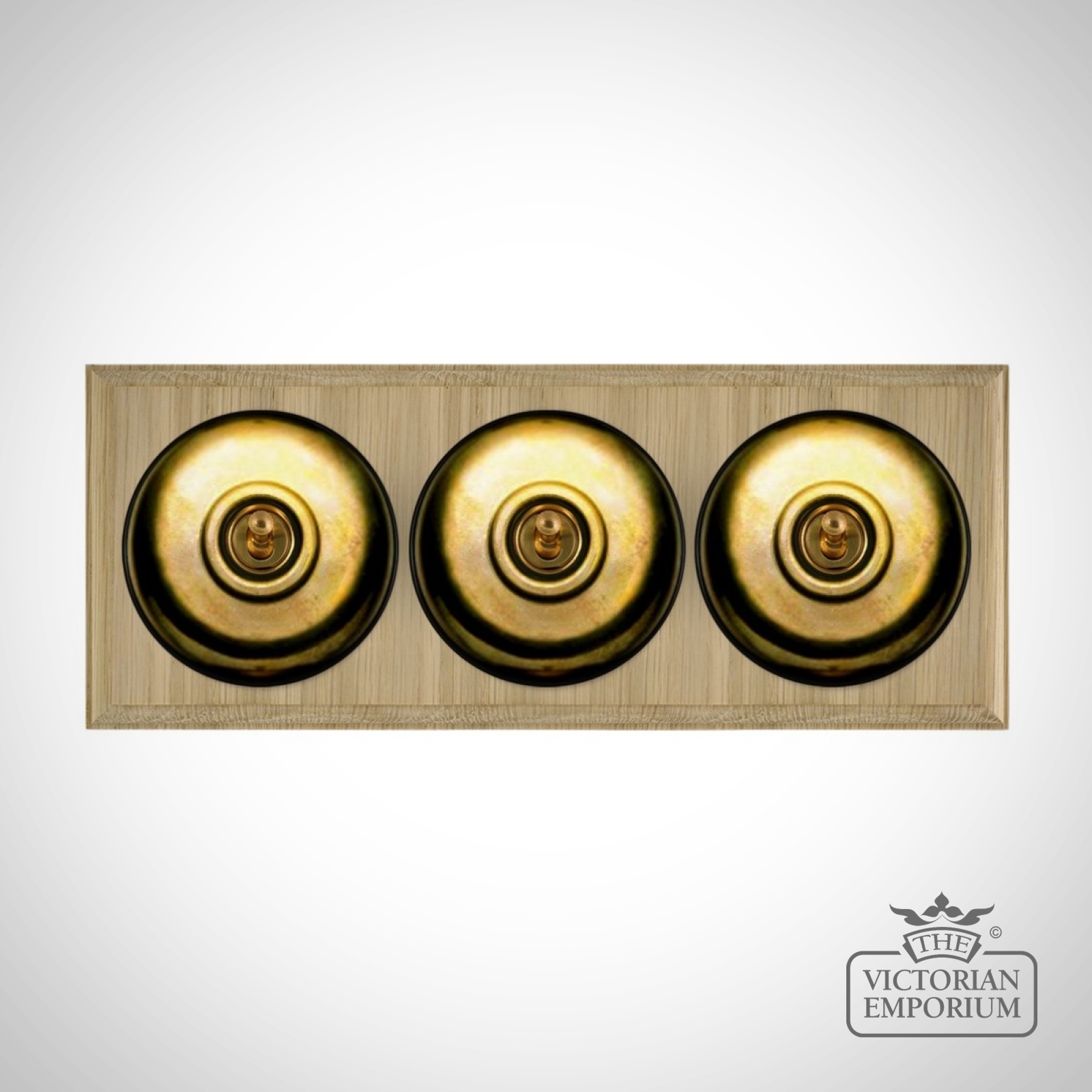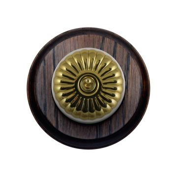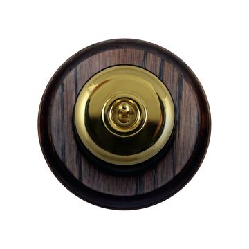 These are reproduced from original light switches from around 1900. The brass domes are hand finished and have oak pattresses.