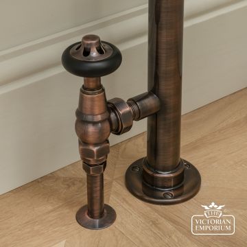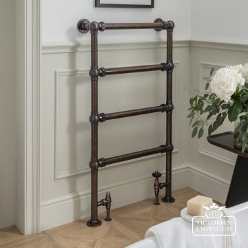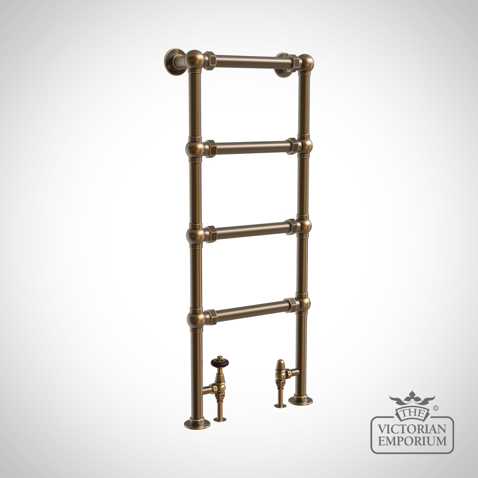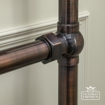 These stunning towel warmers are fixed to both the floor and the wall. They are handcrafted in the UK from oversized brass tubes and ball joints and feature the elegant look of a precision nut assembly.