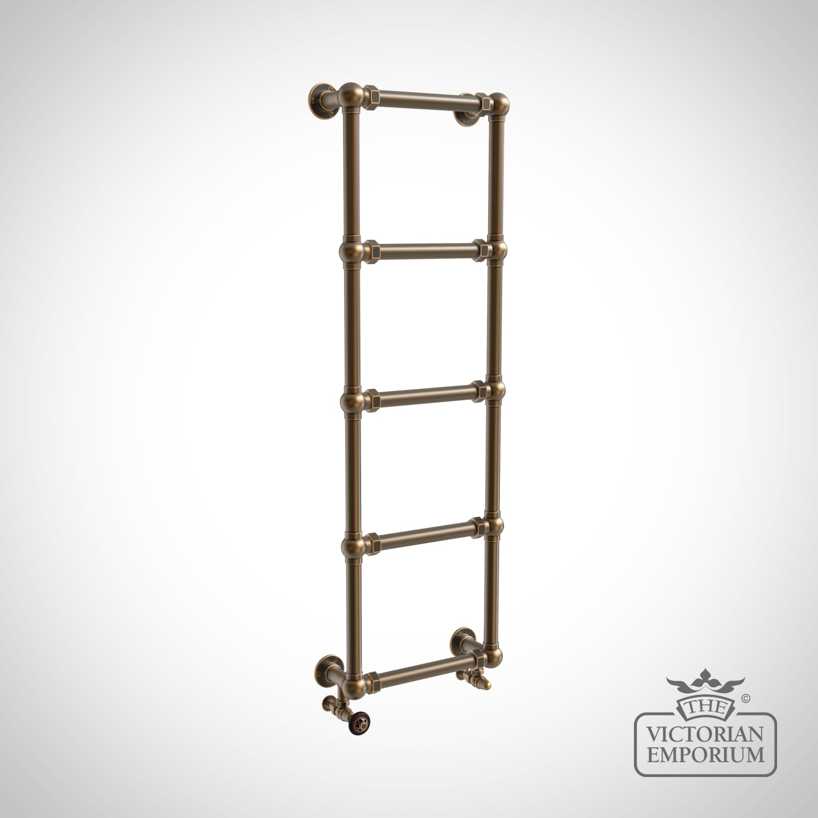 These stunning towel warmers are fixed to the wall. They are handcrafted in the UK from oversized brass tubes and ball joints and feature the elegant look of a precision nut assembly.