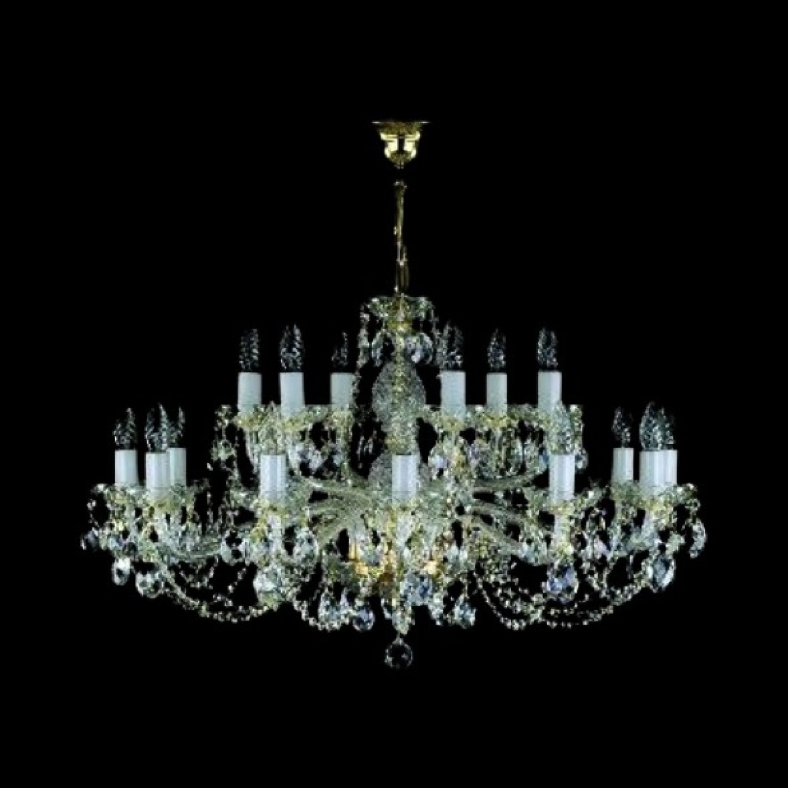 30% PbO crystal chandelier with twisted glass arms, white glass candle sleeves, ornate glass bobeches, delicate crystal chains and oval shaped crystal drop