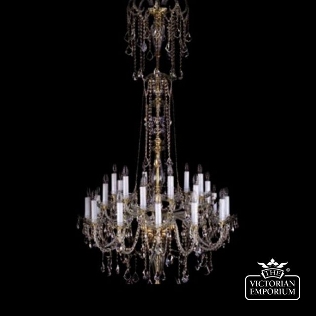 Exquisite finely detailed design. Dressed with cascades of shimmering lead crystal chains and crystal pendles. Suitable for hallways, stairwells, galleried landings, large rooms with high ceilings, country houses, mansions, stately homes etc. Laden with crystal trimmings this chandelier will reflect with the light beautifully to create colours of the spectrum. Chandelier shown in the gold finish.