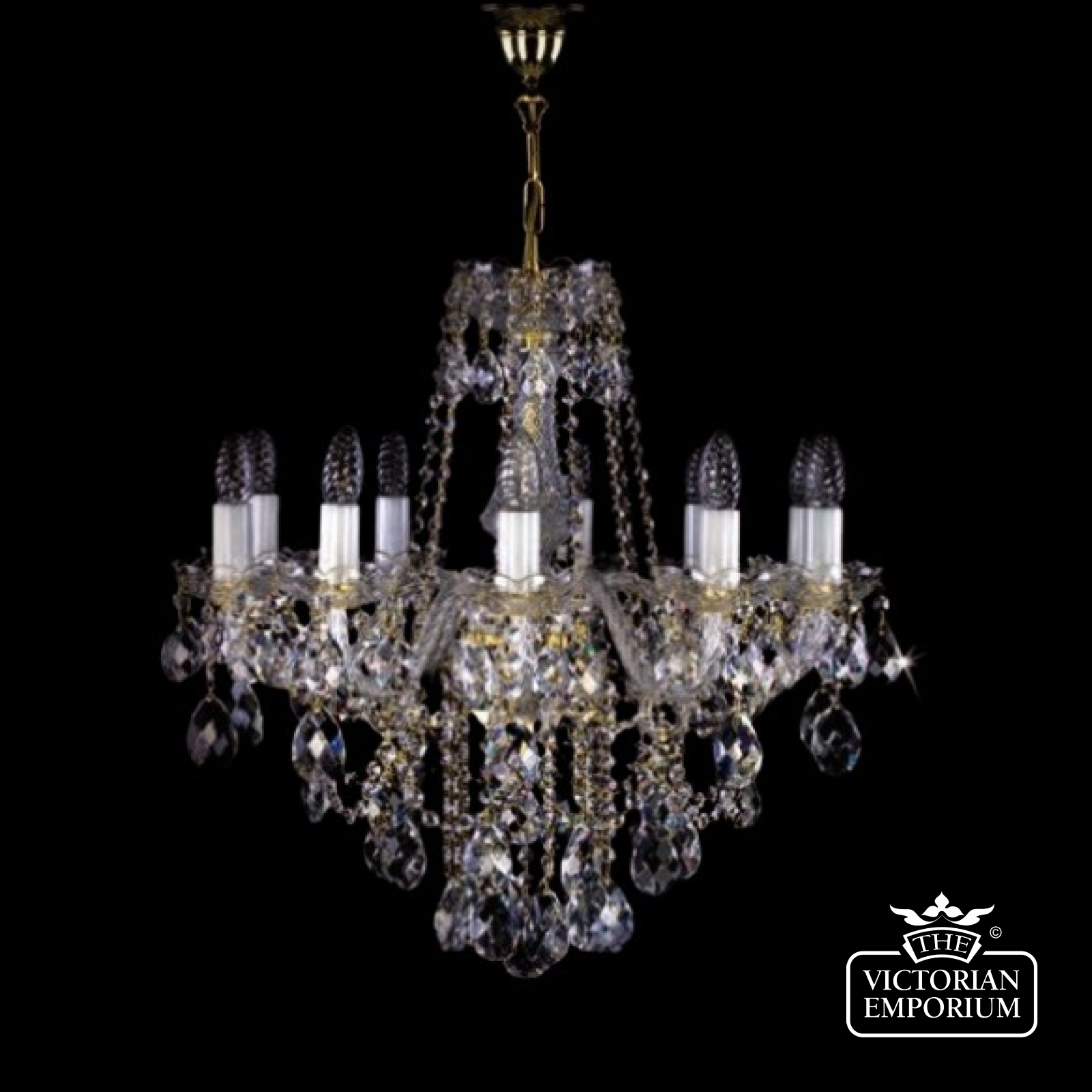 Bohemian crystal (30%PbO) chandelier. For medium sized rooms and standard to higher ceilings. Lead crystal trimmings sparkle beautifully when reflecting with the light. Chandelier shown in the gold finish.