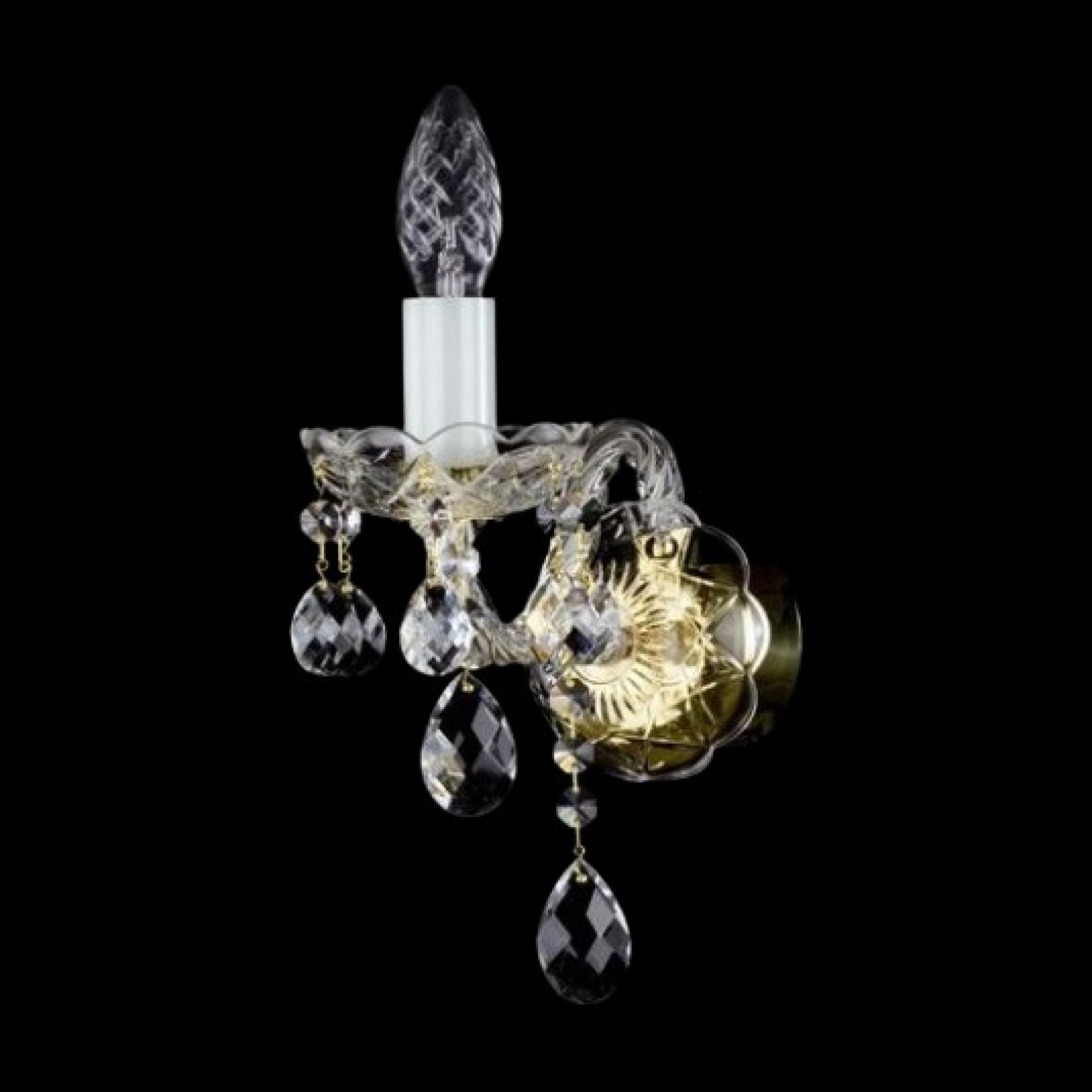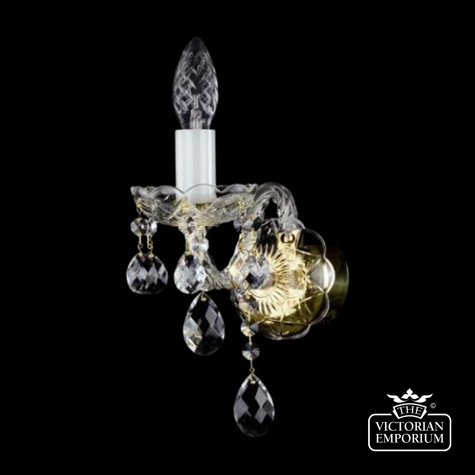 Beautiful single wall sconce with oval shaped 30% PbO crystal oval shape drops, rope twist glass arms, ornate glass bobeches and white glass candle holders