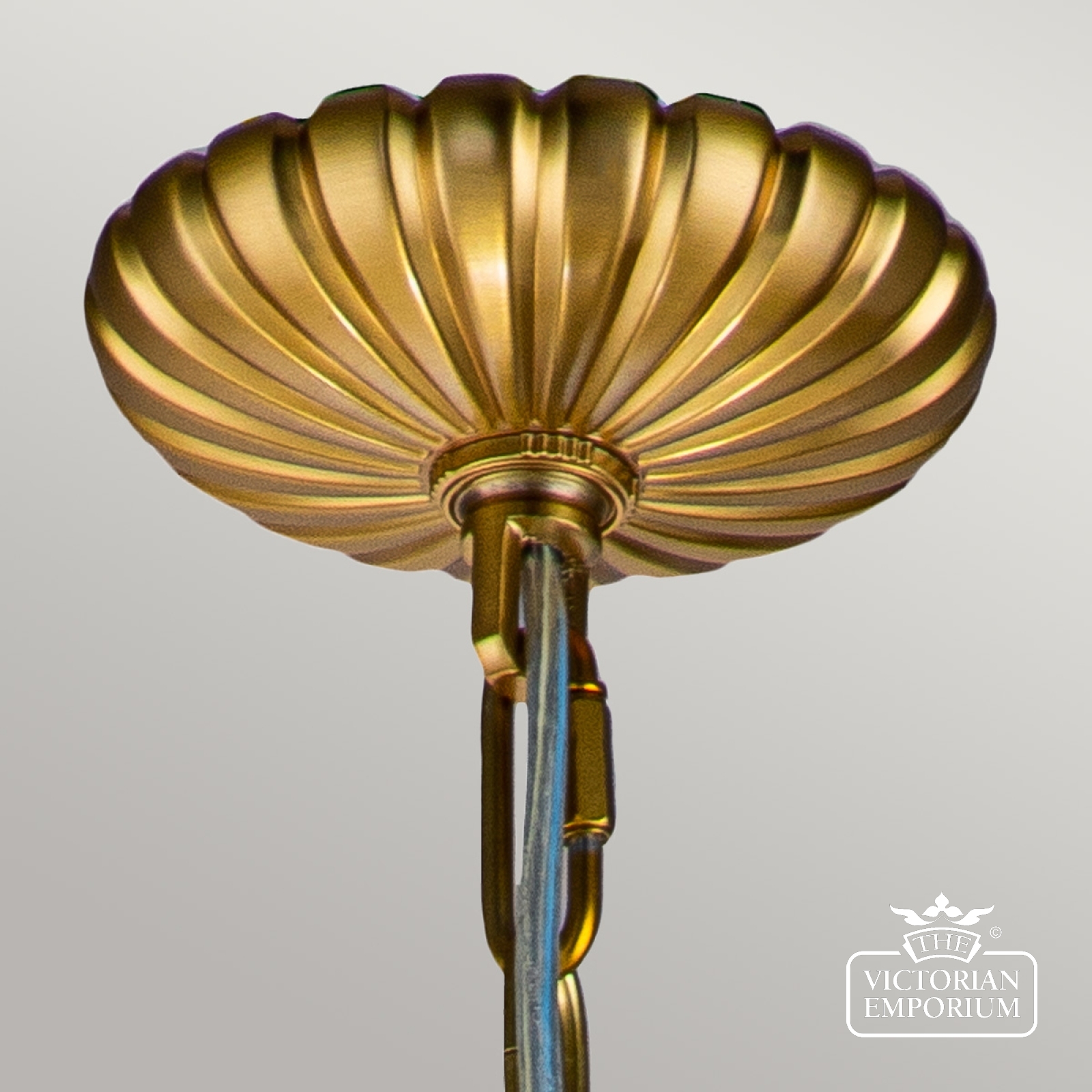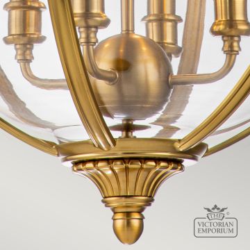 Inspired by the Victorian era, this Adam 4 light pendant with burnished brass finish features a classic glass orb with vintage cast rosette details. Both the crown and the ceiling canopy are surrounded by a decorative metal casing to achieve superior detailing with the same rosette detail featured on the centre strap.