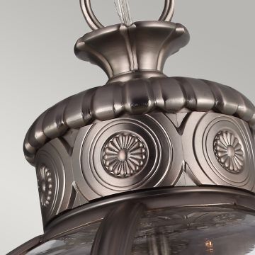 Inspired by the Victorian era, this Adam 3 light pendant with antique nickel finish features a classic glass orb with vintage cast rosette details. Both the crown and the ceiling canopy are surrounded by a decorative metal casing to achieve superior detailing with the same rosette detail featured on the centre strap.