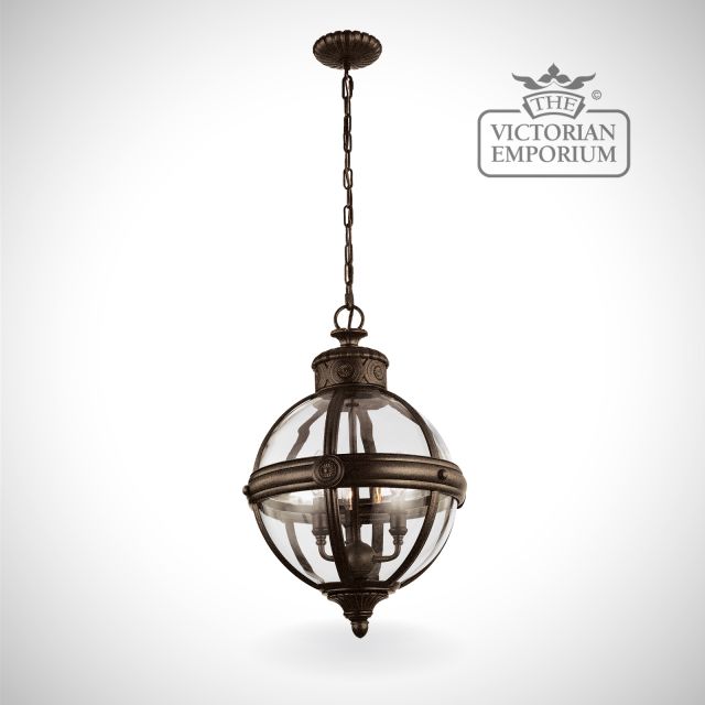 Inspired by the Victorian era, this Adam 3 light pendant with British bronze finish features a classic glass orb with vintage cast rosette details. Both the crown and the ceiling canopy are surrounded by a decorative metal casing to achieve superior detailing with the same rosette detail featured on the centre strap.