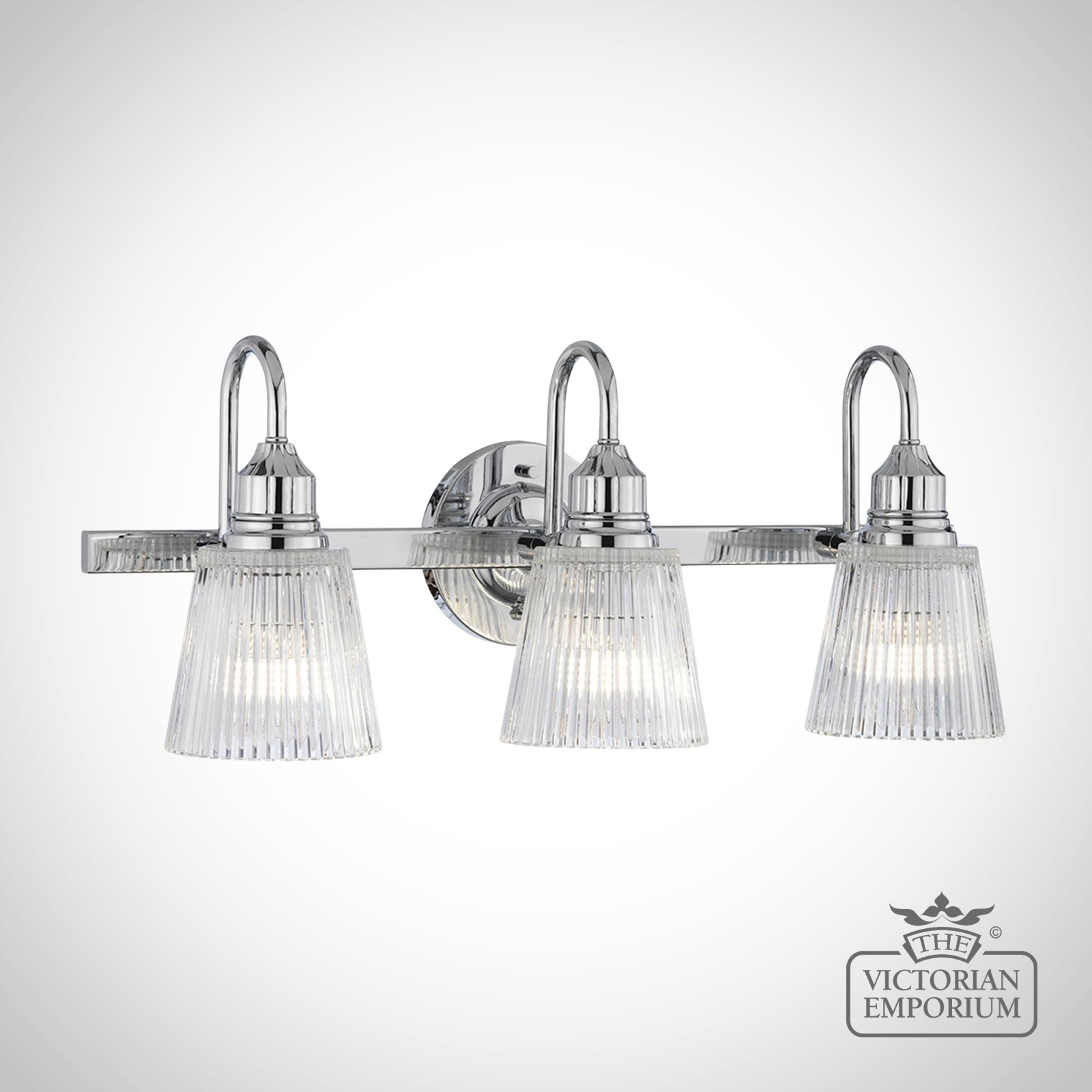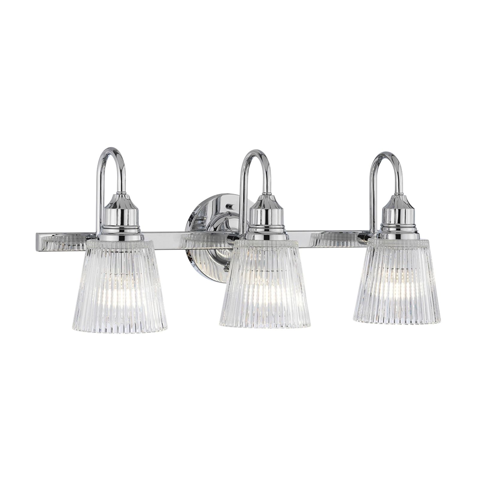 Triple Bathroom Wall Light featuring clean lines and refined details in chrome and glass. This light can be used facing up or downwards. IP44 rated - safe for bathroom use