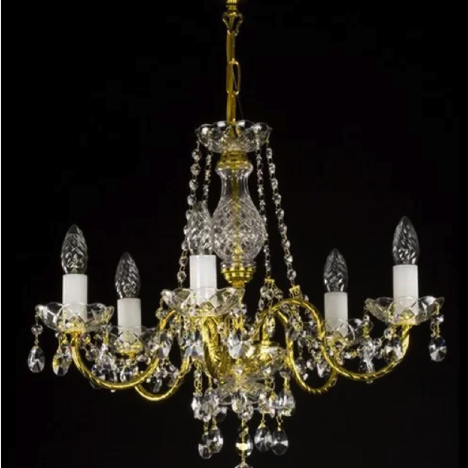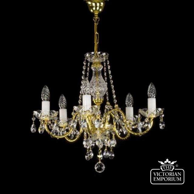 A traditional chandelier with gold-rimmed arms and oval-shaped lead crystals for standard ceiling heights and medium-sized rooms