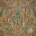 A totemic Giant Eagle Owl with outstretched wings oversees the impressive scene, where palm trees proudly fan out their sculptural leaves, heavy with ripening fruit. Animals appear in mirrored pairs, from balletic giraffes to a dazzle of frolicking zebra alongside some of southern Africa's most endangered animals like the fiery-toned Painted Dog and stately Roan Antelope.