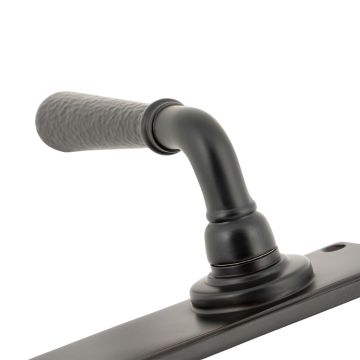 This hammered handle with a textured surface is forged from solid bronze. This handle has a strong spring incorporated into the design to provide functionality and elegance.
