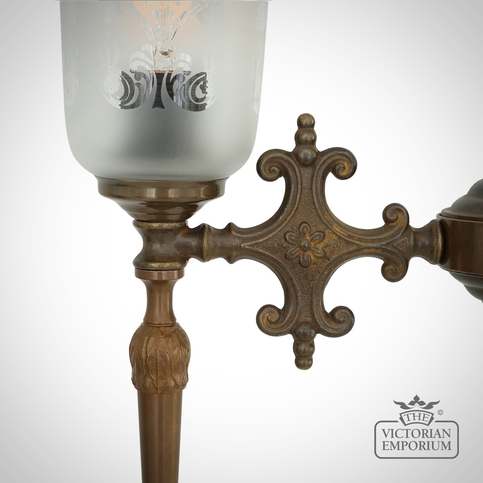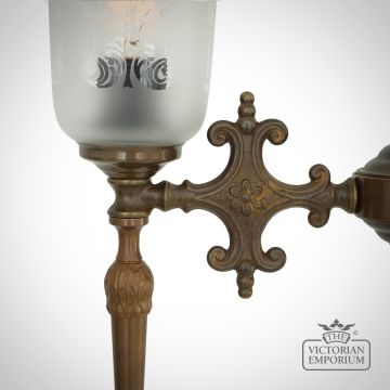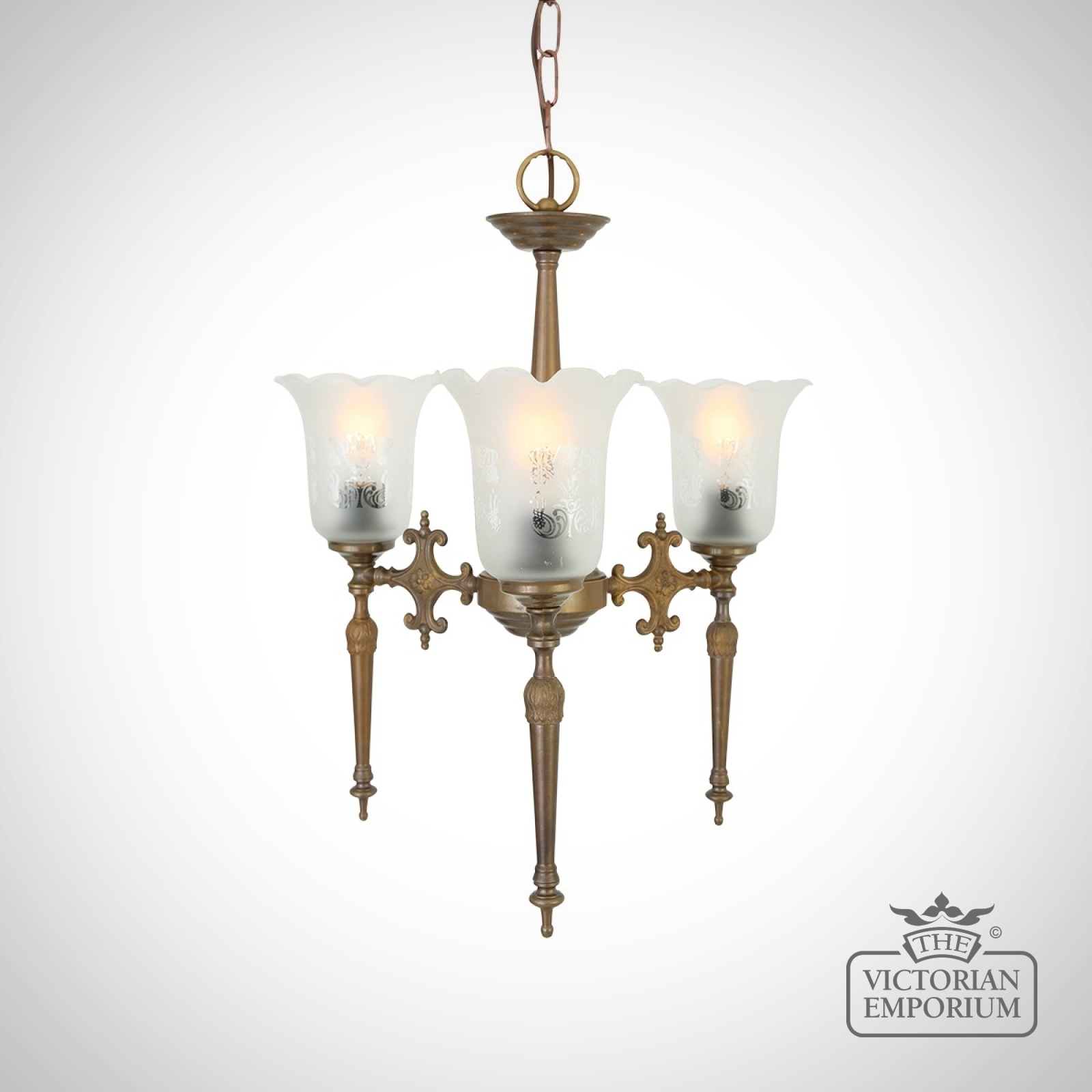 This is a traditional three-arm chandelier, with each arm secured to a central column with a design centring around a lamp torch design with a Victorian bell glass lamp shade