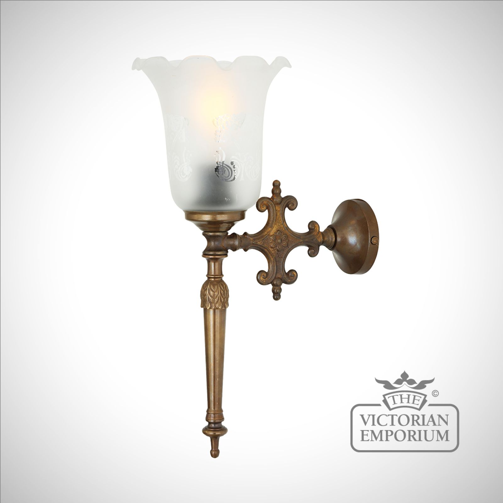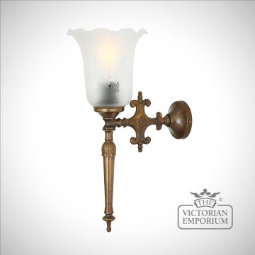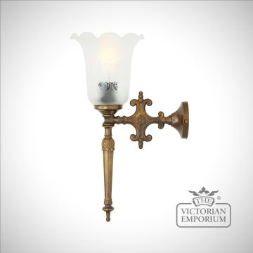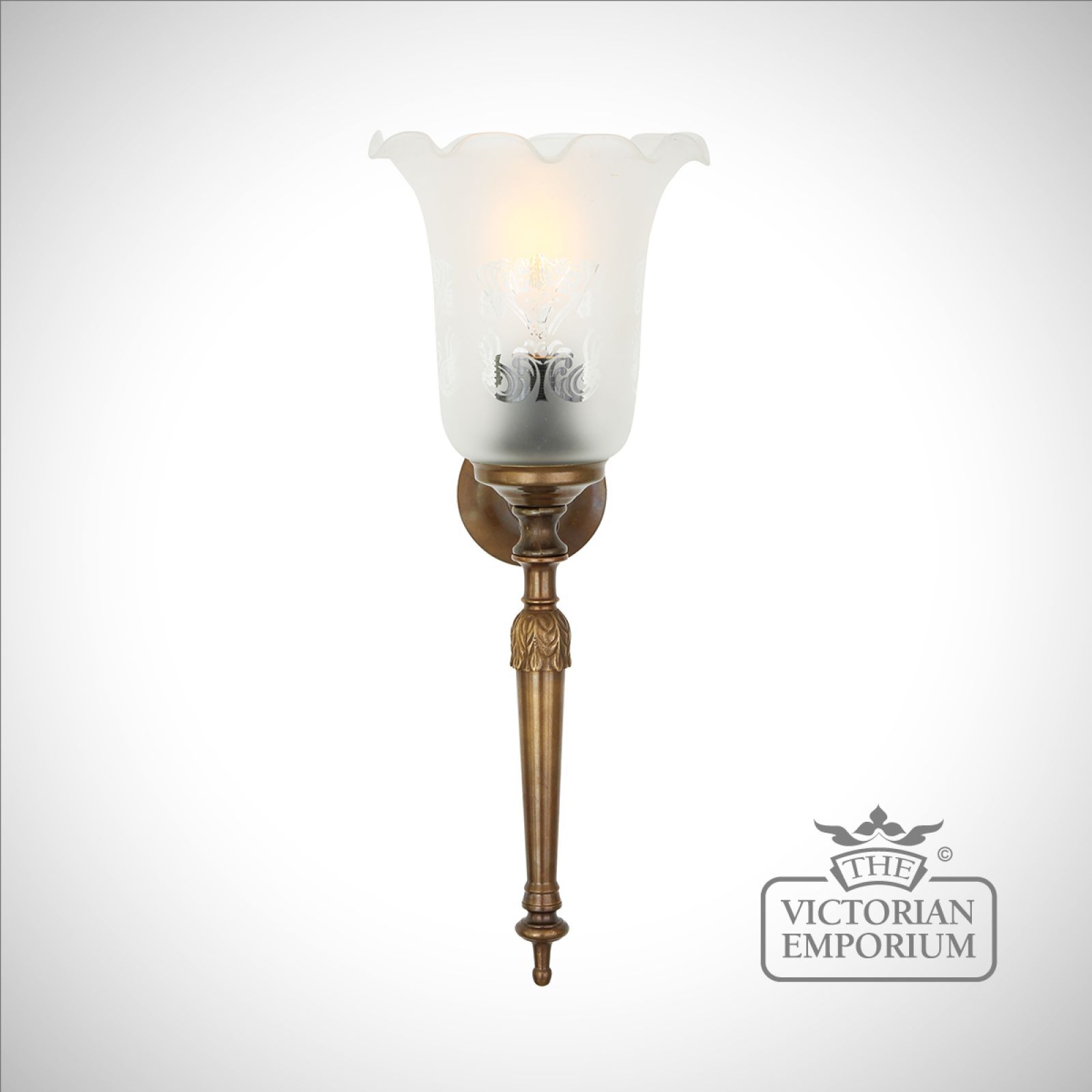 The Allen wall light is a traditional wall light with an etched Victorian bell glass lamp shade, inspired by an ornate “fire torch”. It has a brass stem and Victorian glass shade with hidden light bulb as the flame.