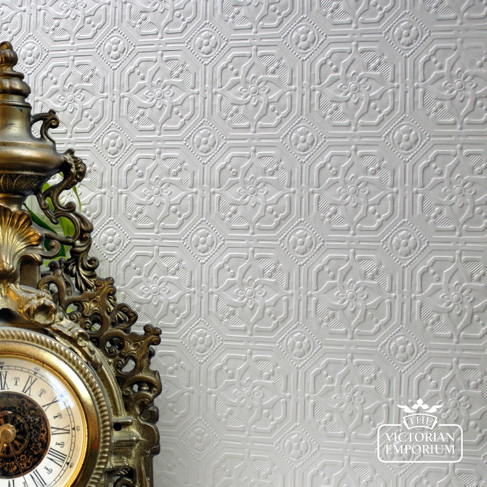 This embossed wallpaper has classically styled variegated geometric design that brings a vintage feel to your home. Inspired by decorative Victorian rooms.