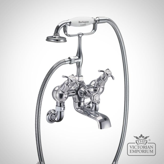 Angled Bath shower mixer including the standard cradle, ‘S’ adjuster, ceramic diverter, hose, ceramic telephone handset, with tap heads, bases and unions