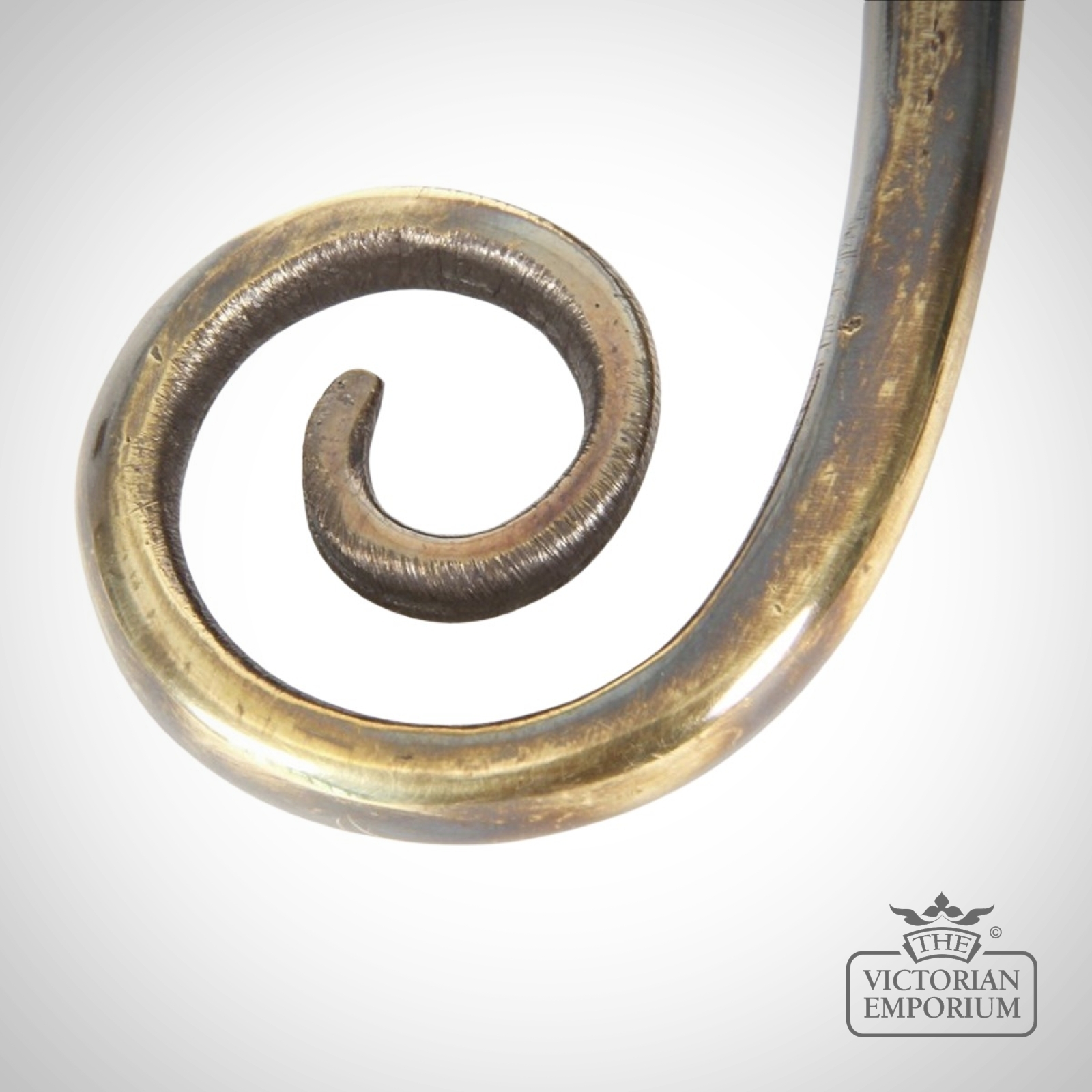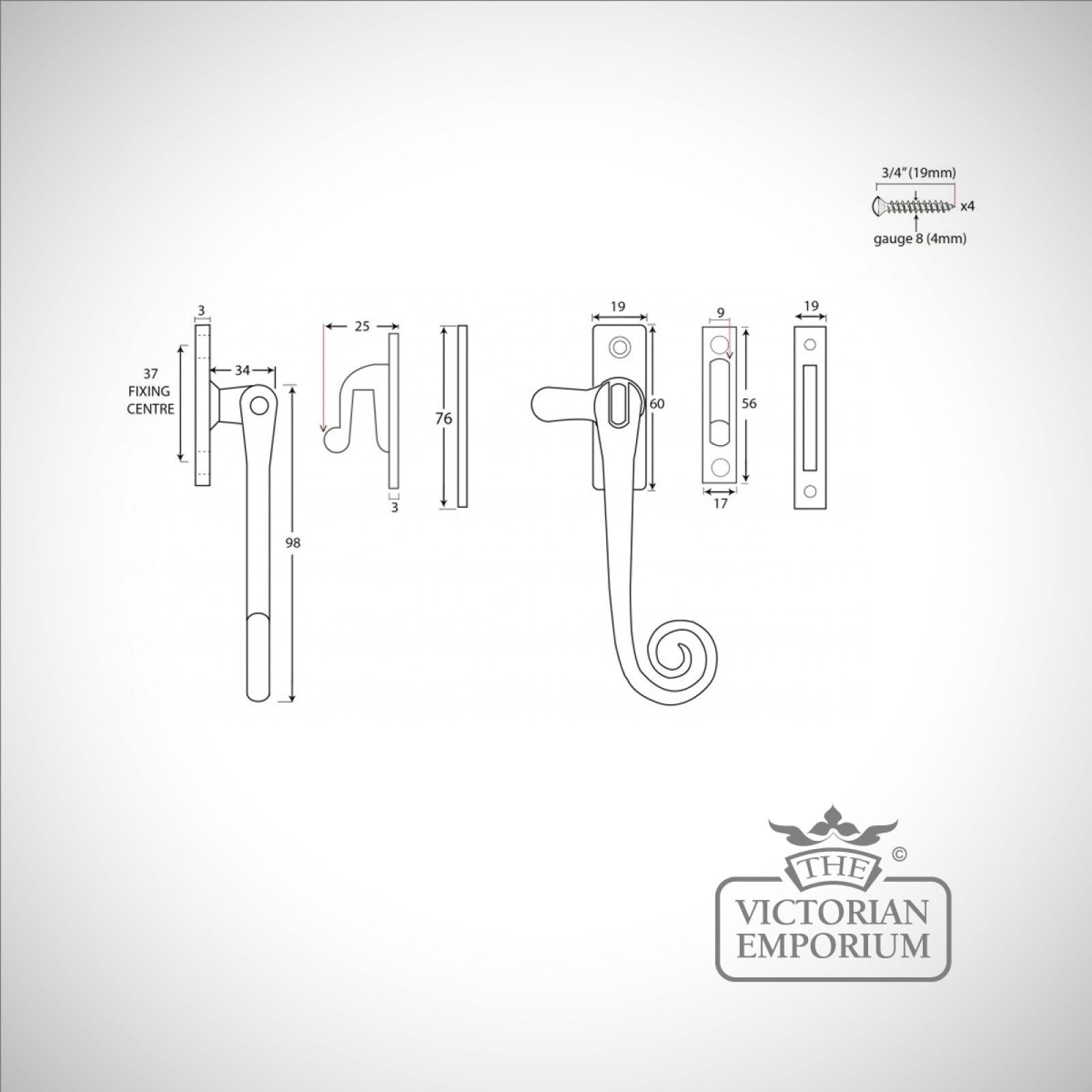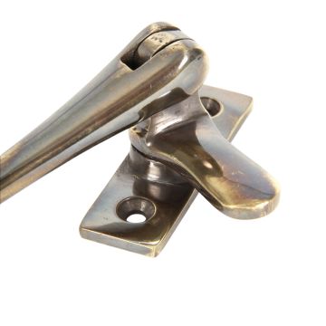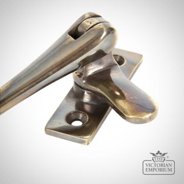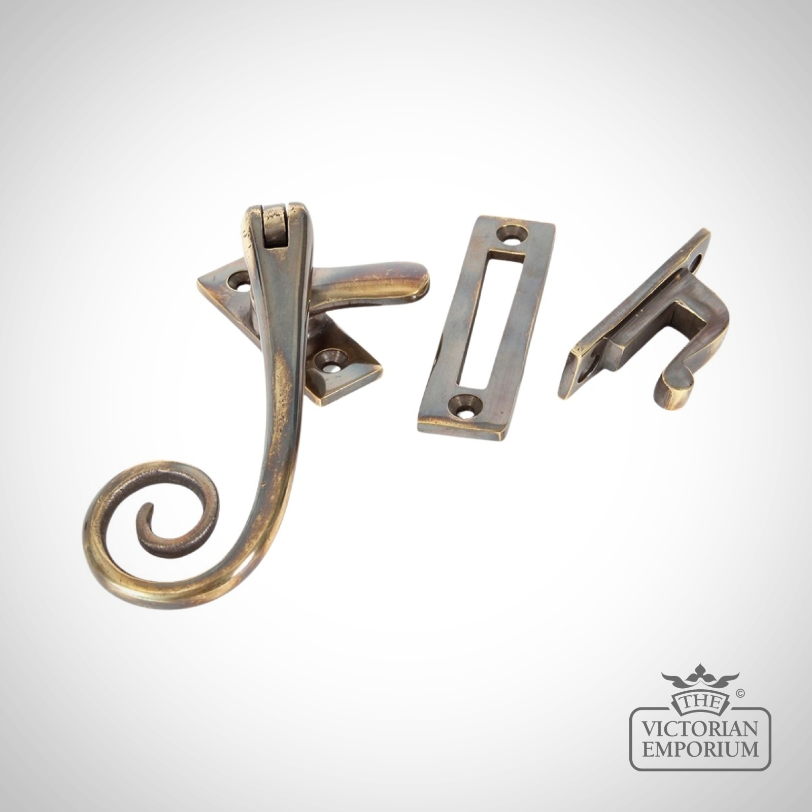 A cast Monkey-tail Fastener in antique brass which is reversible and allows use on either left or right handed windows, ideal for windows with a draught seal due to the Mortice Plate allowing the pulling of the window as far as the seal allows.