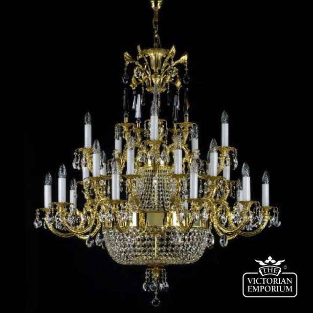 The crystal trimmings on our chandeliers are as follows: Exclusive Bohemian Crystal (Czech republic 30%PbO). The machine cut trimmings are characteristic with a brilliant polish and decompose the light beams in a light spectrum. Preciosa crystal (Czech republic 30%PbO).