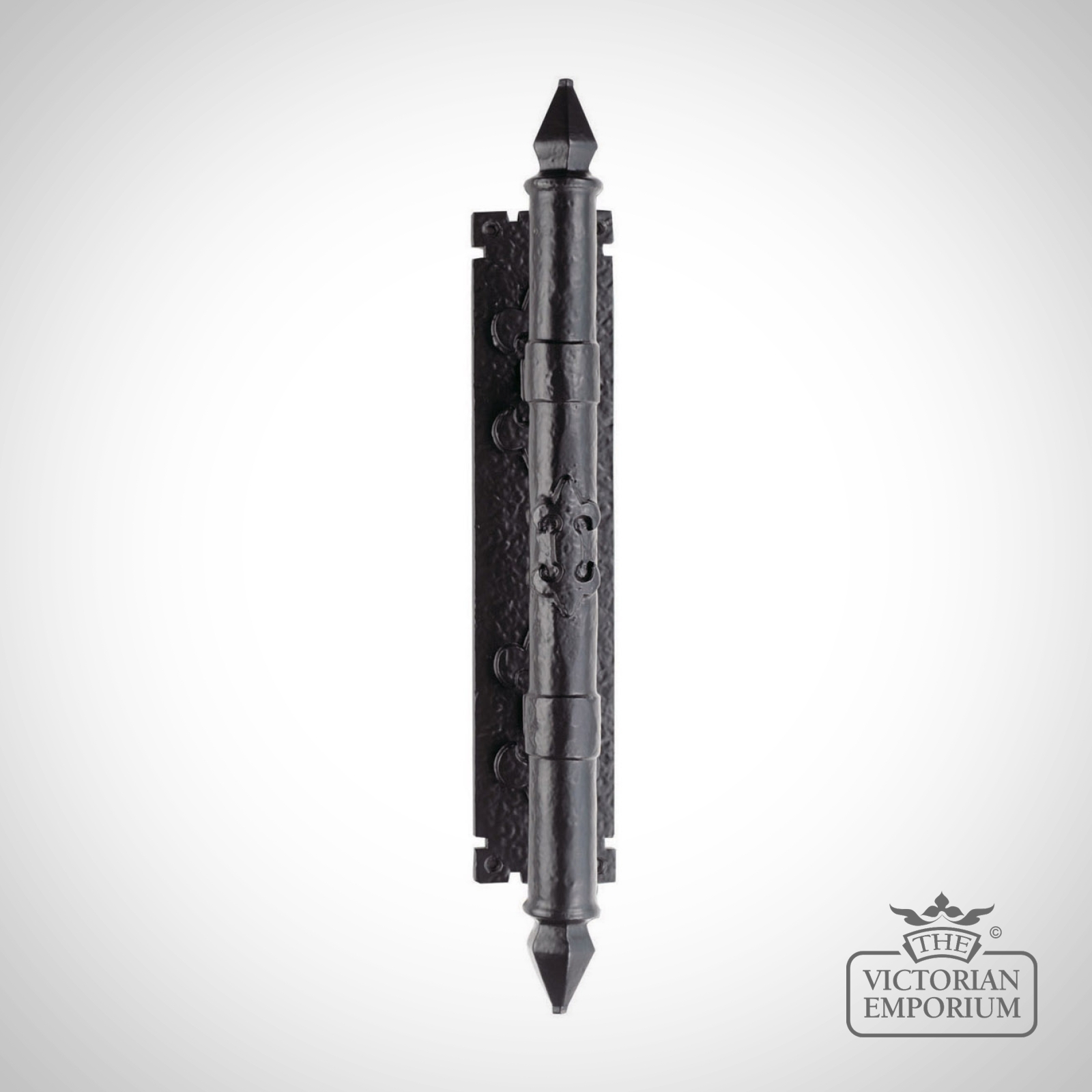 Armorial pull handle on backplate. Black Antique only
