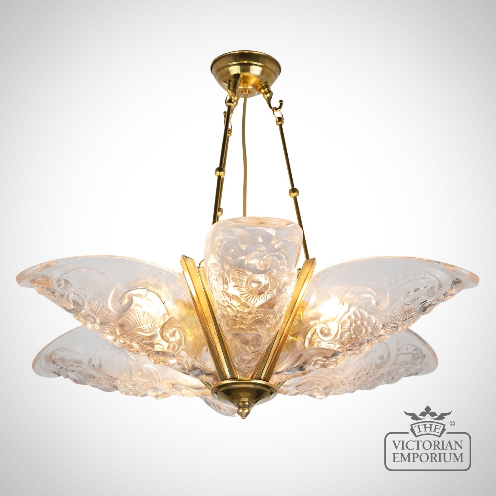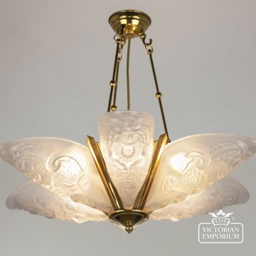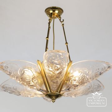 Art Nouveau Ceiling Chandelier with solid brass metalwork, hand cast using thick glass with a deep and highly decorative relief pattern.