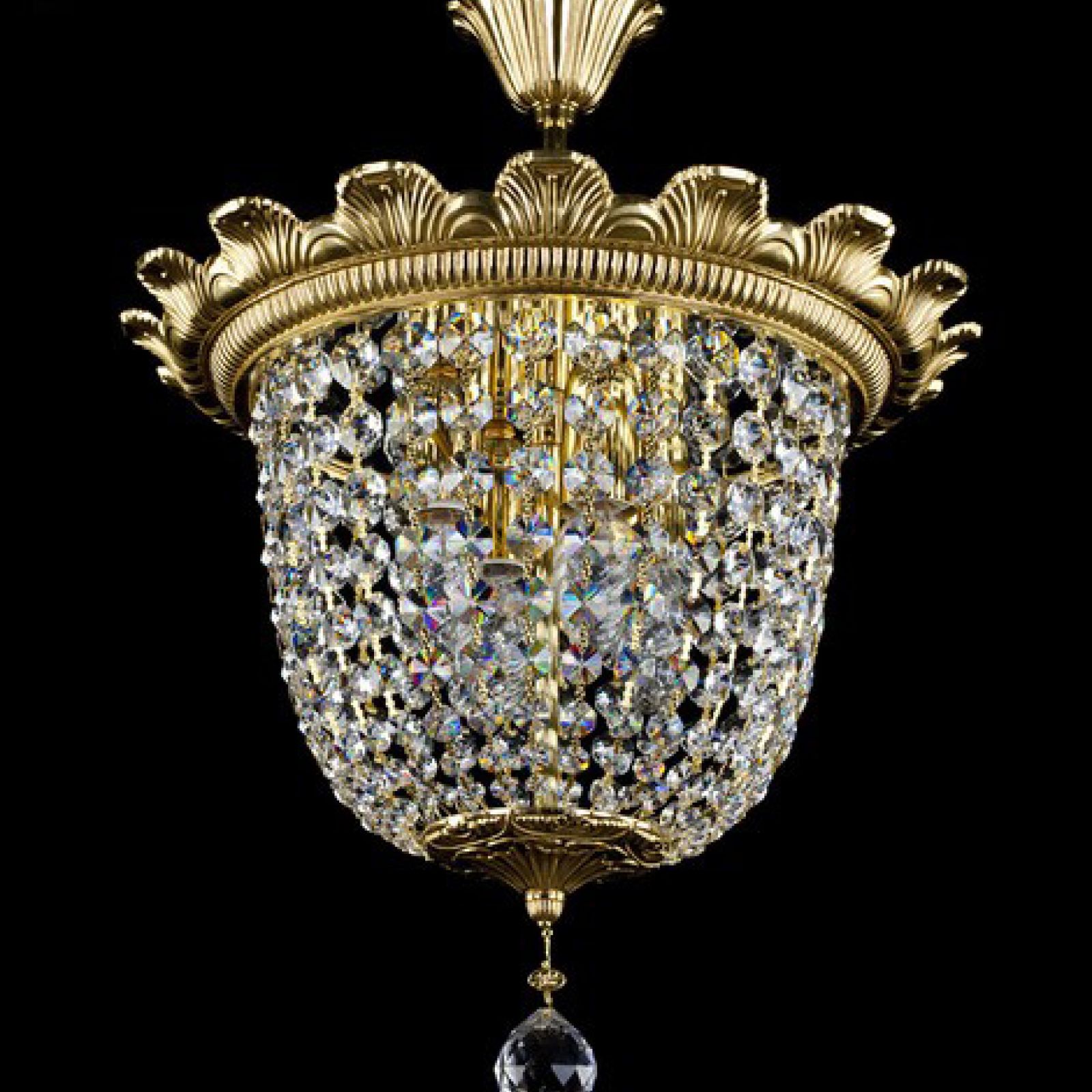 Stunning ornate cast chandelier with bohemian crystal trimmings (30%PbO) in a deep basket shape with a central drop