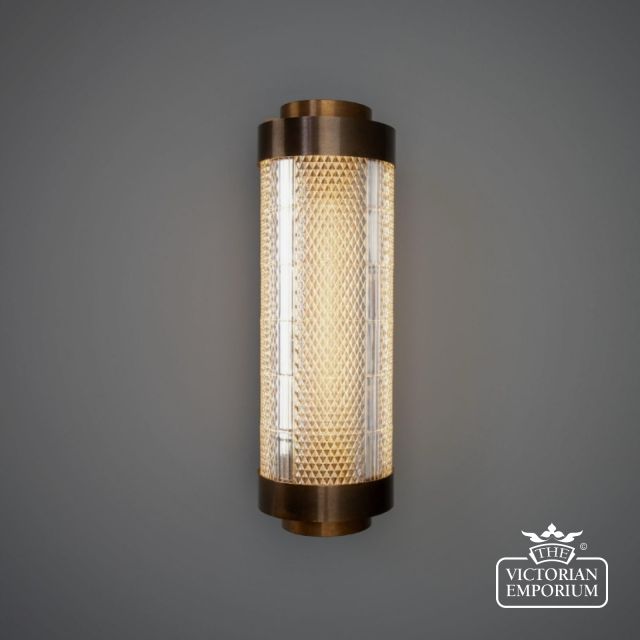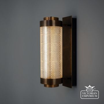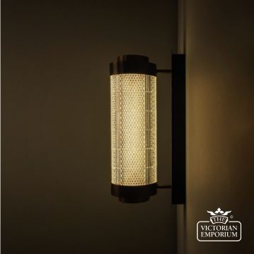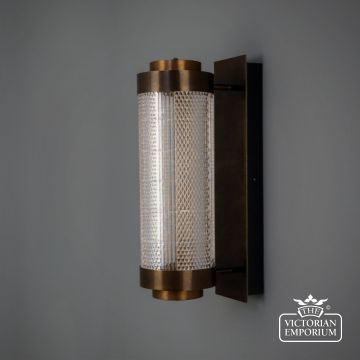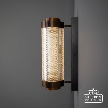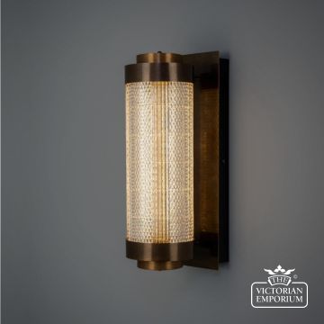 The Ashford Small Wall Light features an elongated cylindrical shade with diamond-patterned acrylic, framed in warm brass and set against a solid rectangular backplate.