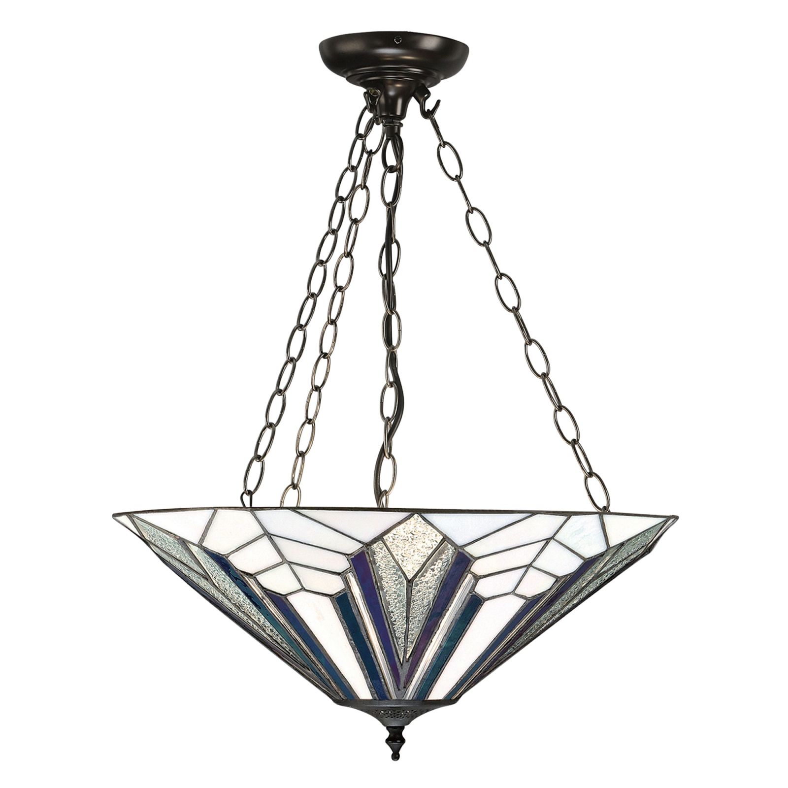 The Astoria large inverted 3 light pendant uses dynamic lines in true art deco style. It uses bevelled and textured glass producing a stunning light effect