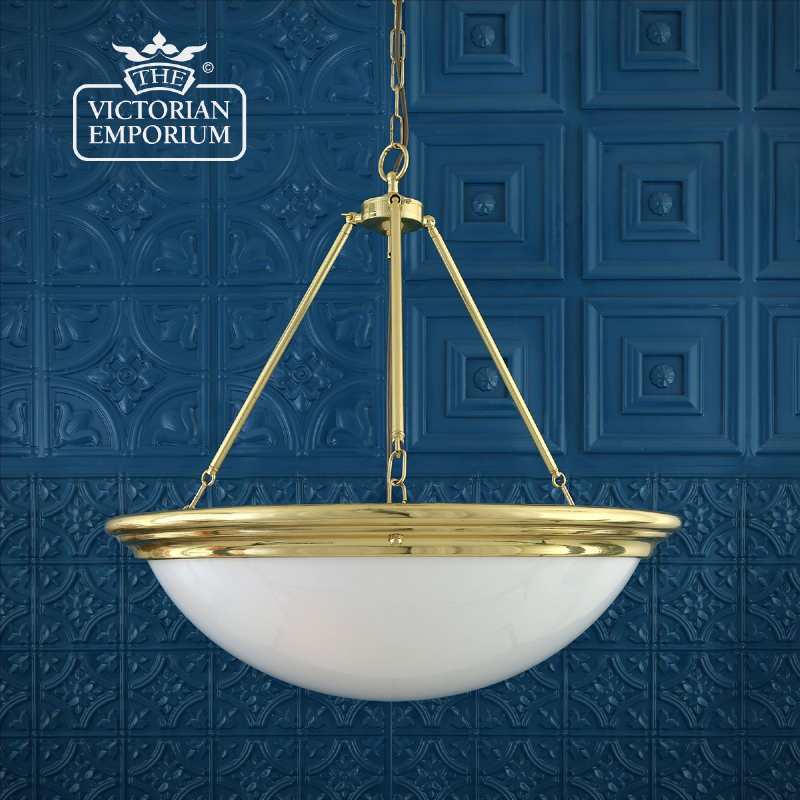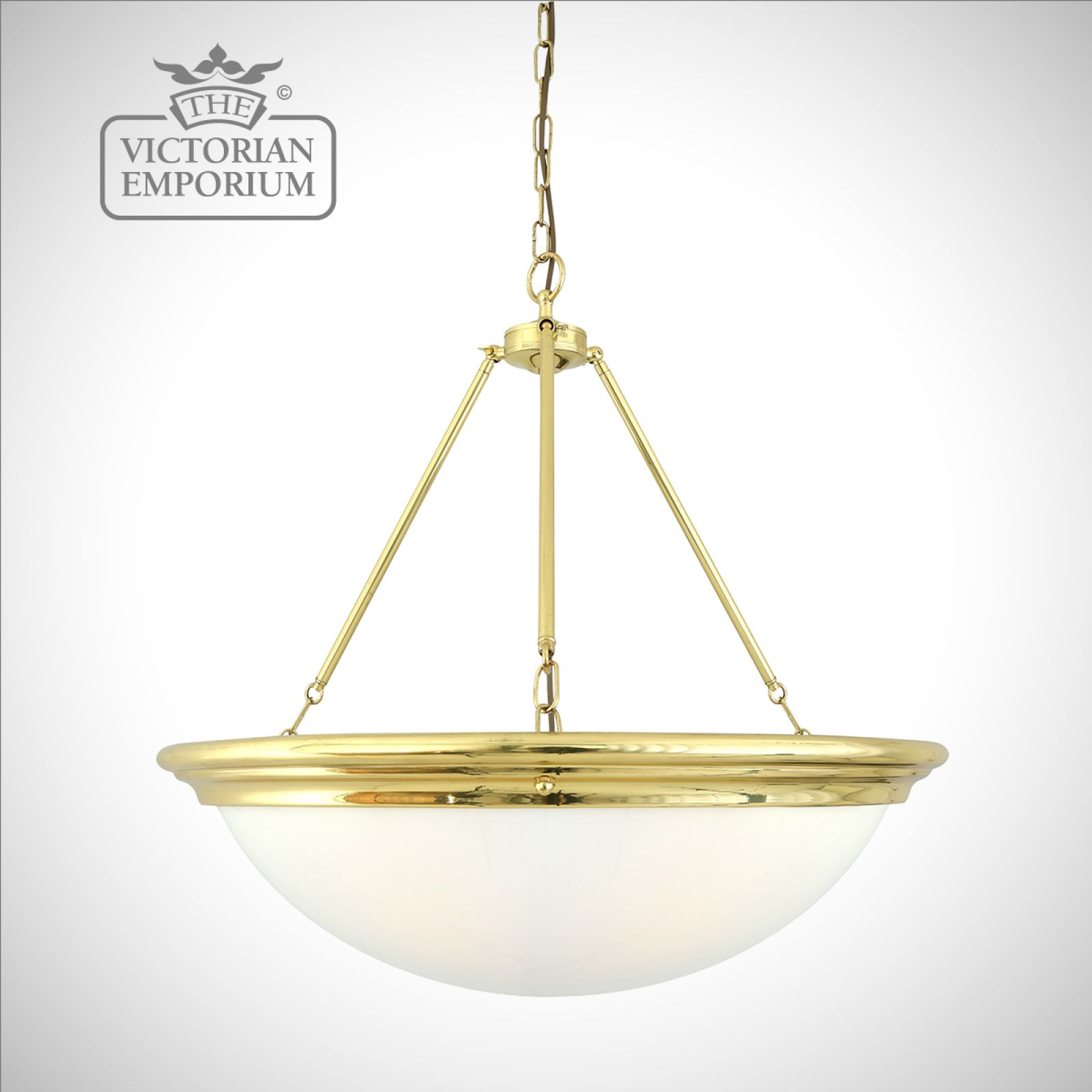 The Athlone large ceiling pendant is a traditional fitting with a shallow, half-dome glass lamp shade. The opal acrylic glass lamp shade is secured to a large brass ring