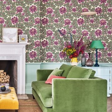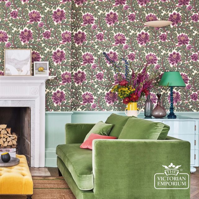 The rich floral tapestry of Aurora captures the atmosphere of a fairytale forest, with its dense thickets and undergrowth. Entirely hand-painted, the design’s inspiration came from archival documents, with its printed detail paying homage to traditional printmaking. Organic tones of Mulberry & Sage on Parchment; Rose & Forest on Charcoal; Petrol & Teal on Ink; as well as the striking Cerise & Cerulean Blue on Midnight make for an unforgettable design in striking hues.