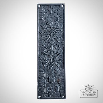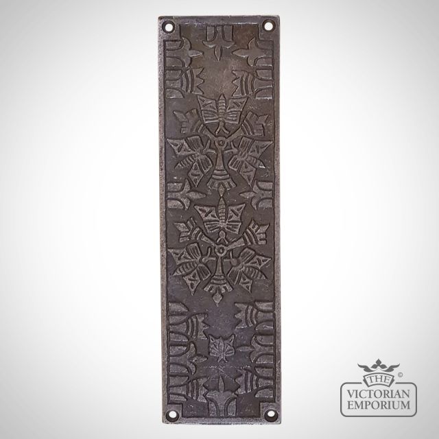 Really beautiful Aztec design push finger plate for a door in antique iron, perfect for traditional doors