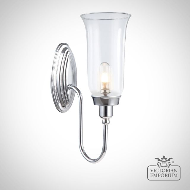 Chrome bathroom wall light with tall elegant glass shade and chrome base
