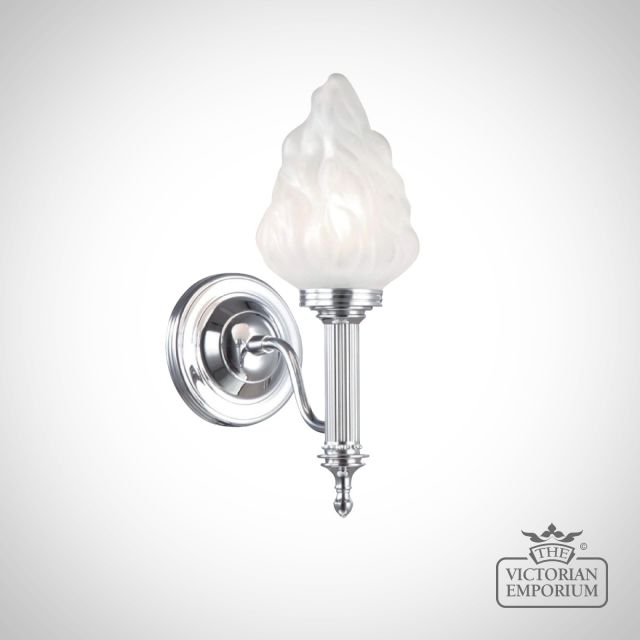 Chrome bathroom wall light with decorative glass shade and circular chrome base