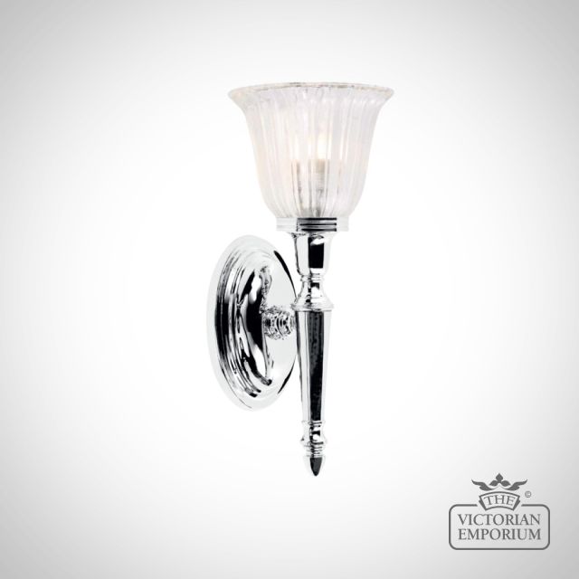 Chrome bathroom wall light with fluted glass shade and circular chrome base