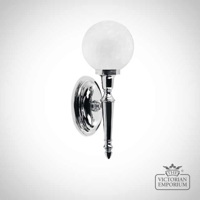Chrome bathroom wall light with simple globe glass shade and circular chrome base