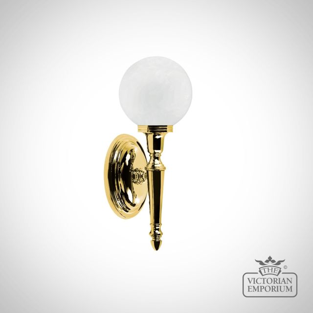 Chrome bathroom wall light with simple globe glass shade and circular brass base