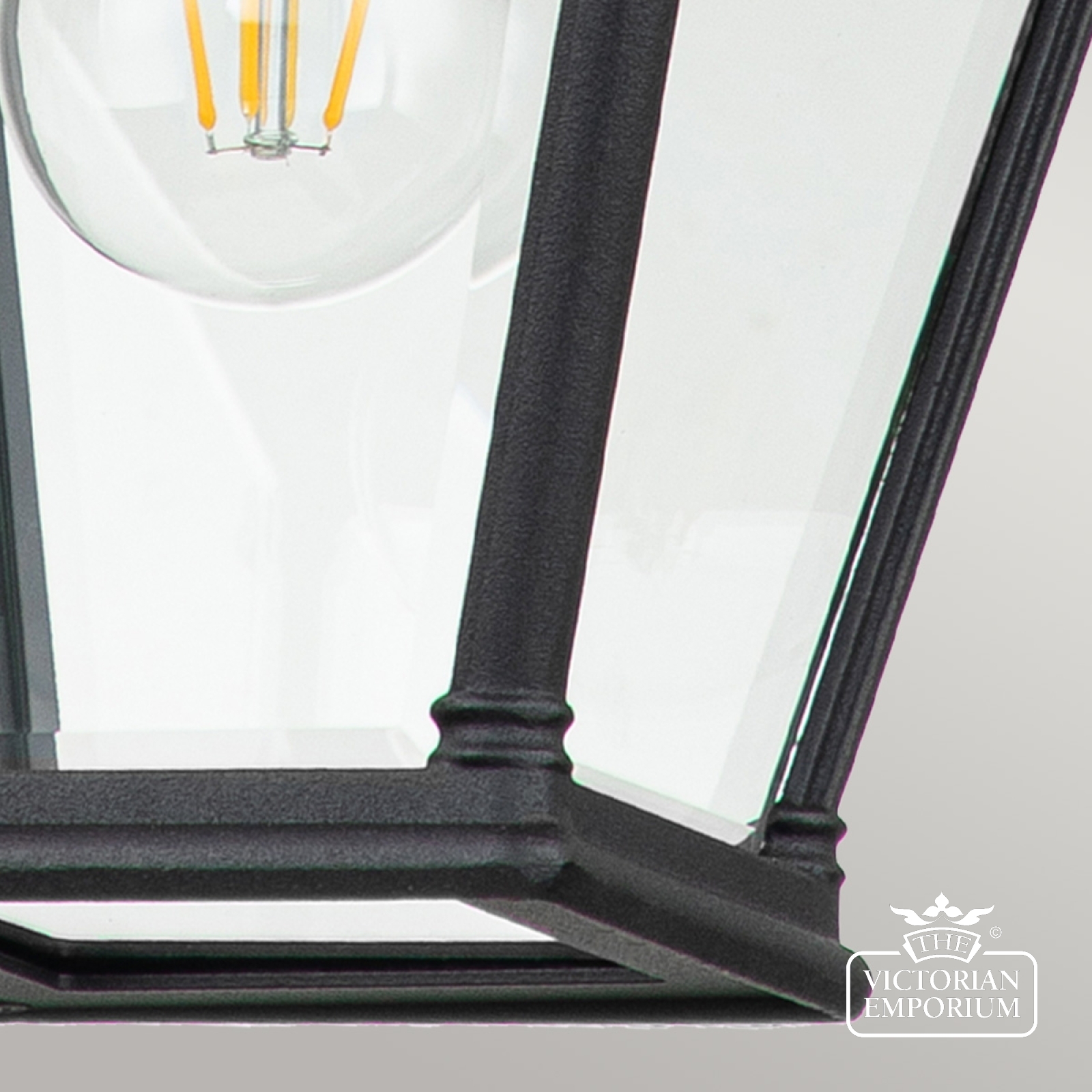 Elegant black wall lantern made from cast aluminium, with clear bevelled glass and a matt black finish with a decorative top finial details.