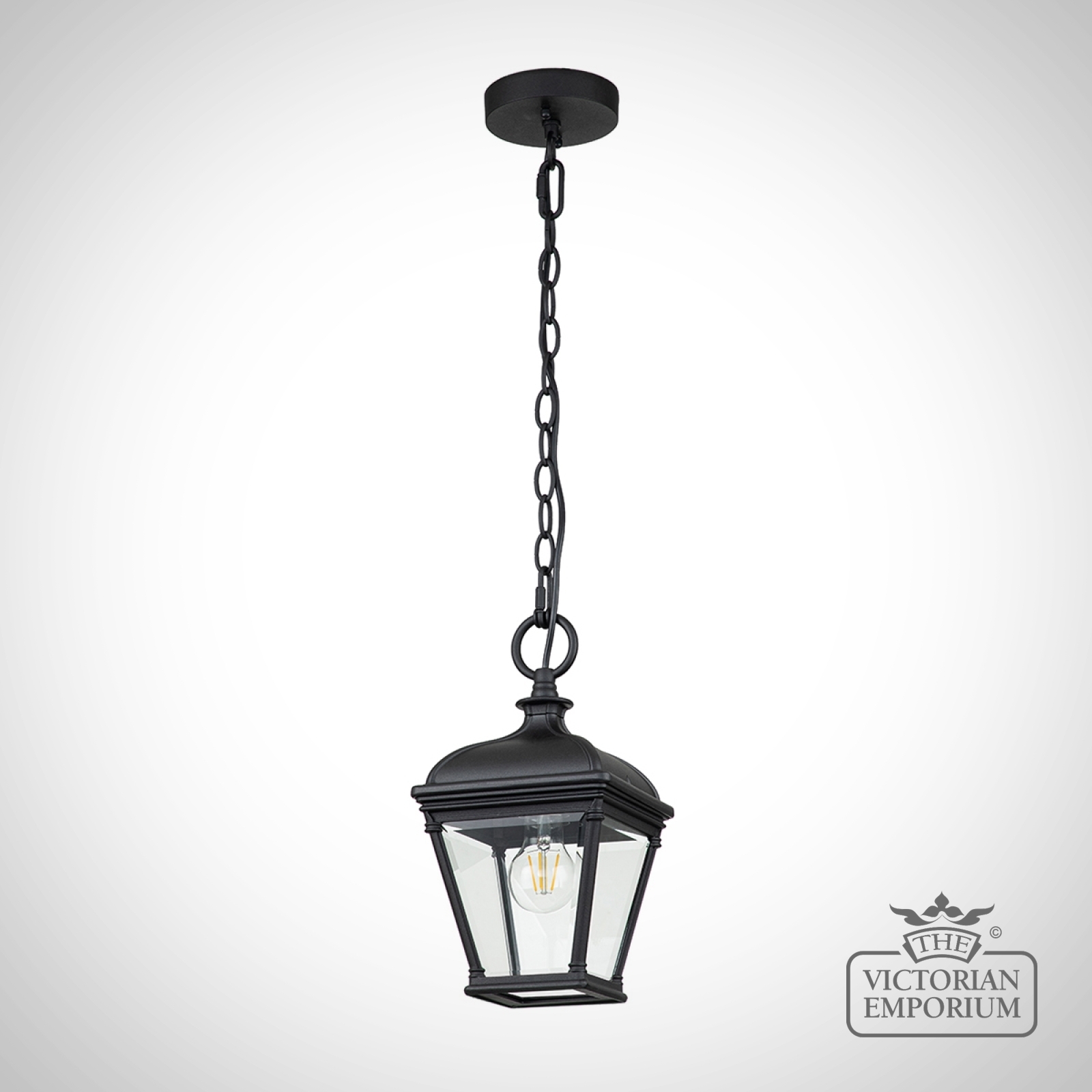 The Bayview has a Georgian elegance, that illuminates any exterior with a crisp stylish presence. This Chain Lantern is a sophisticated design constructed from Aluminium, with clear bevelled Glass, finished in black and IP44 rated.