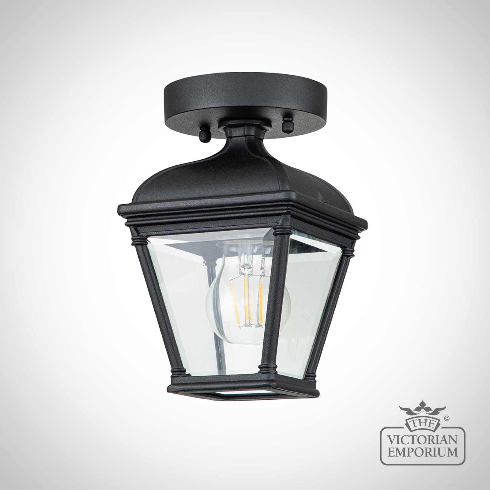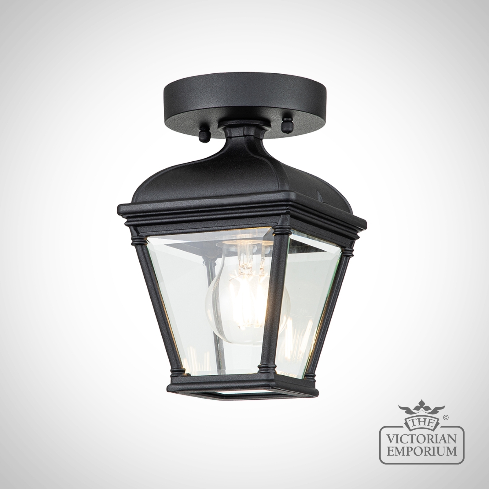 The Bayview has a Georgian elegance, that illuminates any exterior with a crisp stylish presence. This Porch Lantern is a sophisticated design constructed from Aluminium, with clear bevelled Glass, finished in black and IP44 rated.