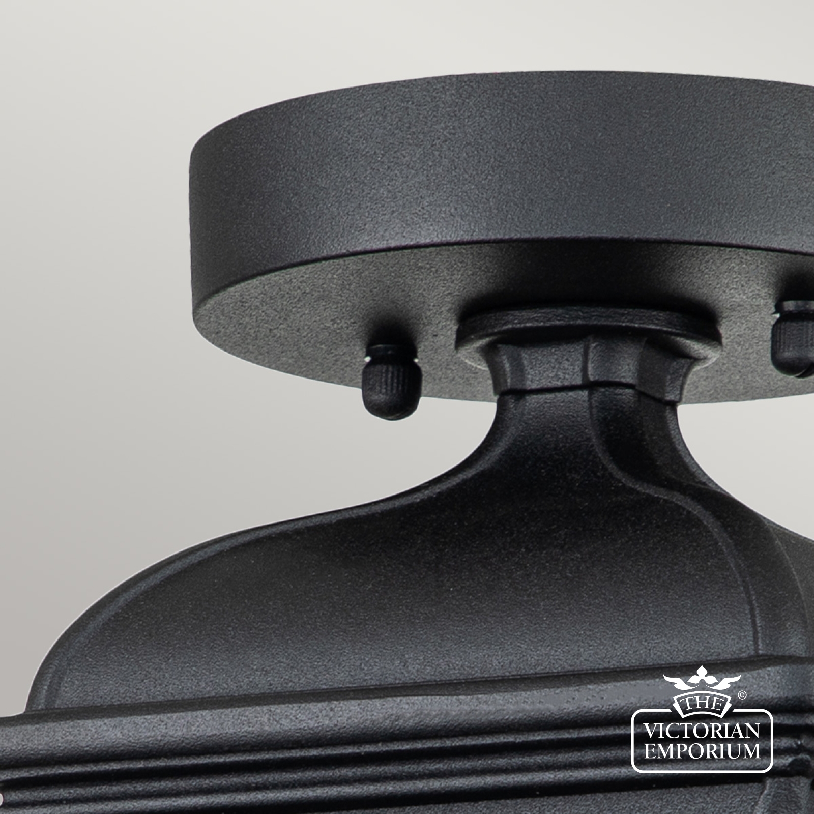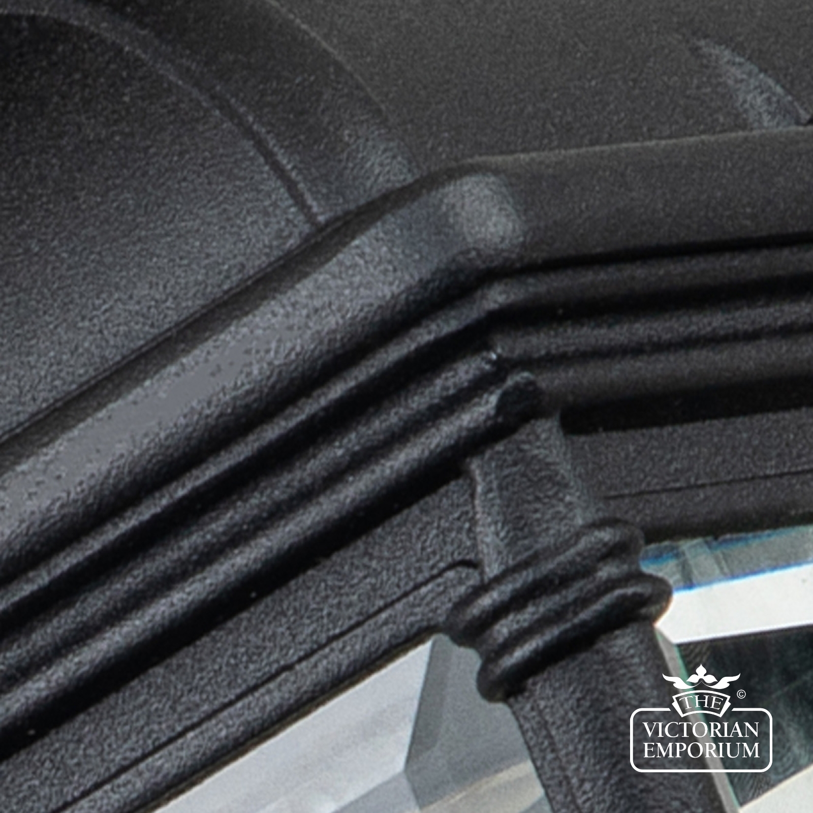 Elegant black wall lantern made from cast aluminium, with clear bevelled glass and a matt black finish with a decorative top finial details.