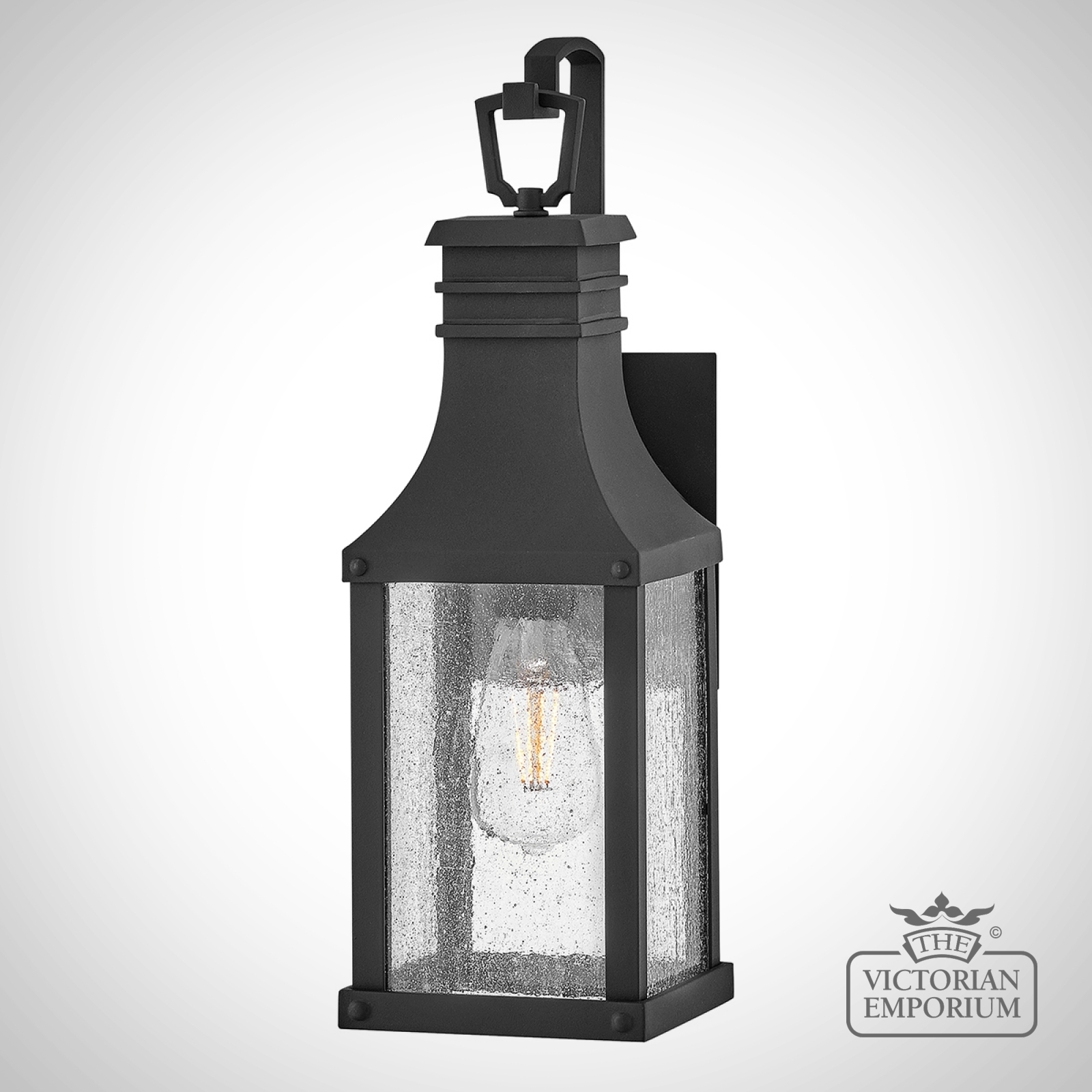 Wall lantern in a period style with a classic boxy shape topped classic curves and seeded glass to give a soft pool of light