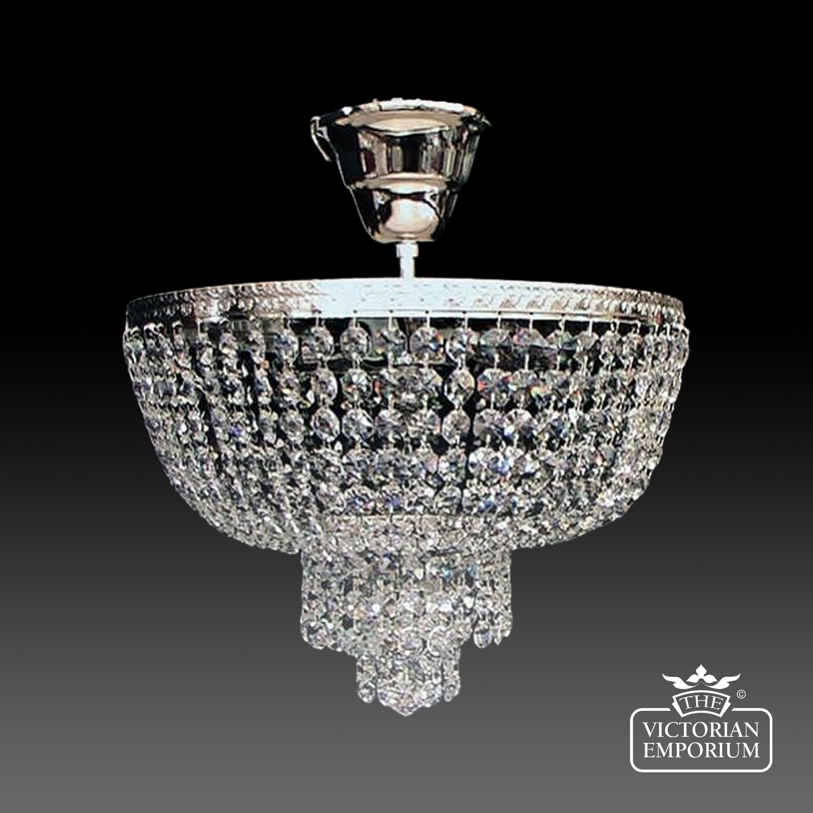 Basket chandeliers are suitable for low, standard, and high ceilings and medium or large rooms. Dressed with Bohemian Czech Lead crystal 30% PbO & 24% PbO.