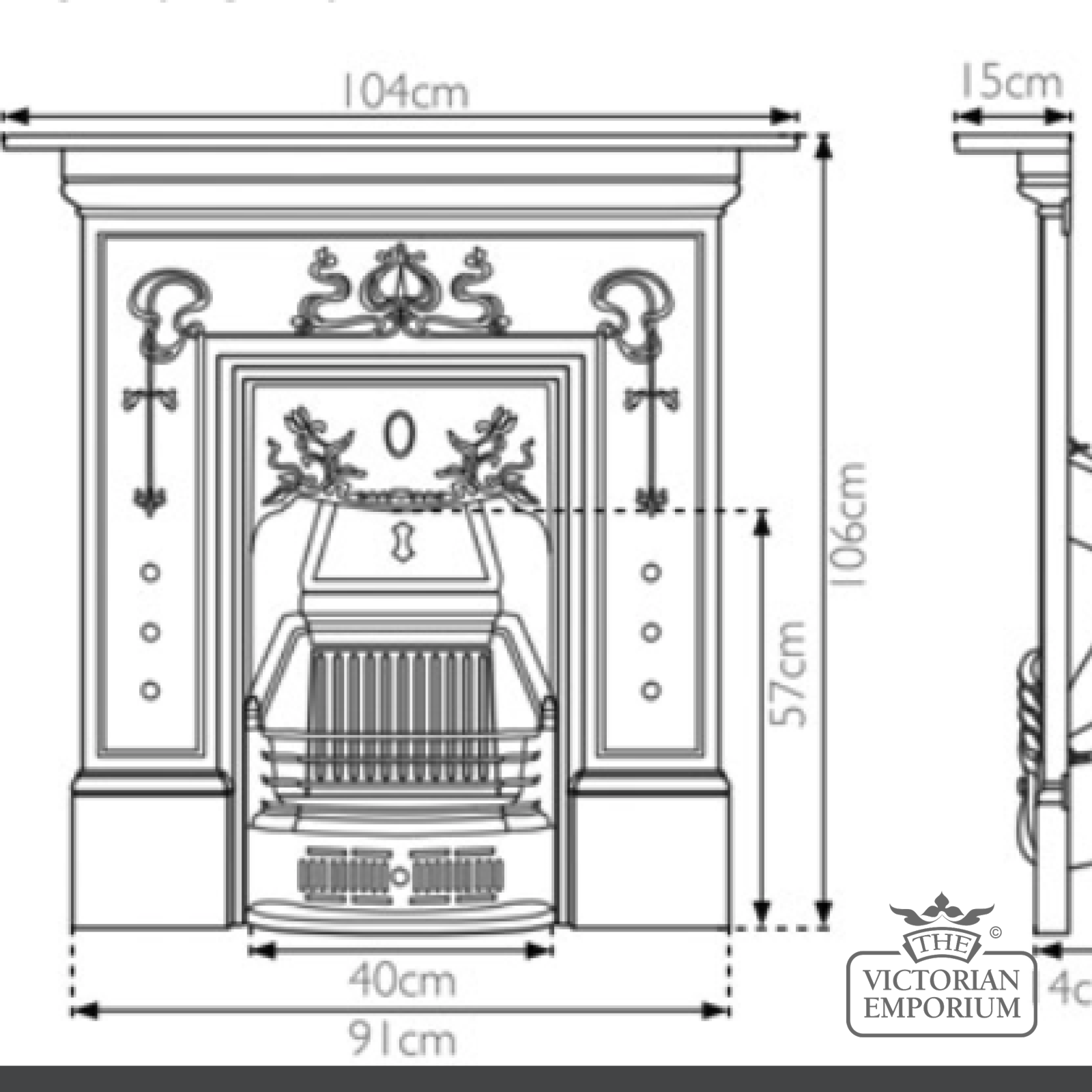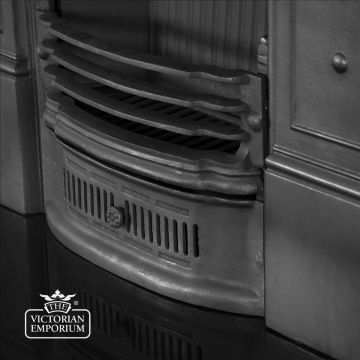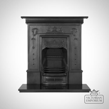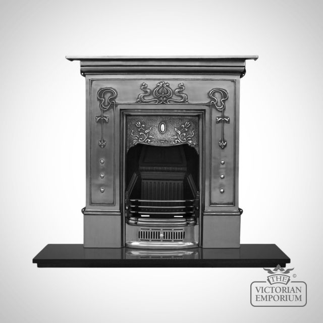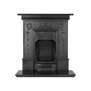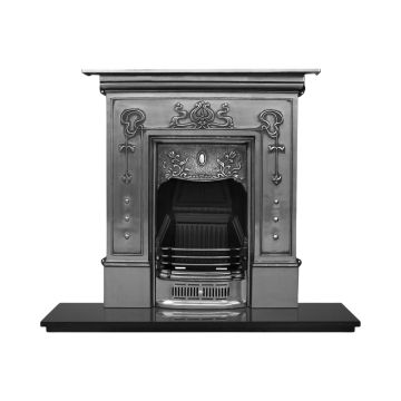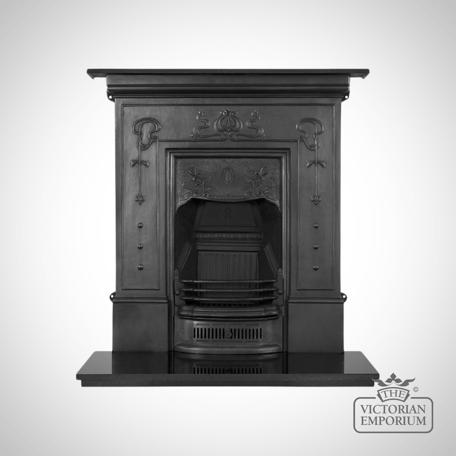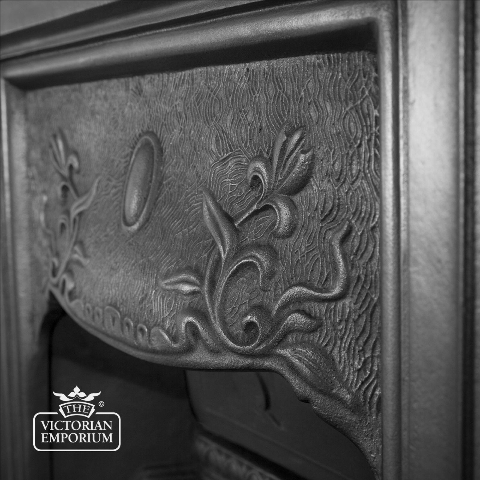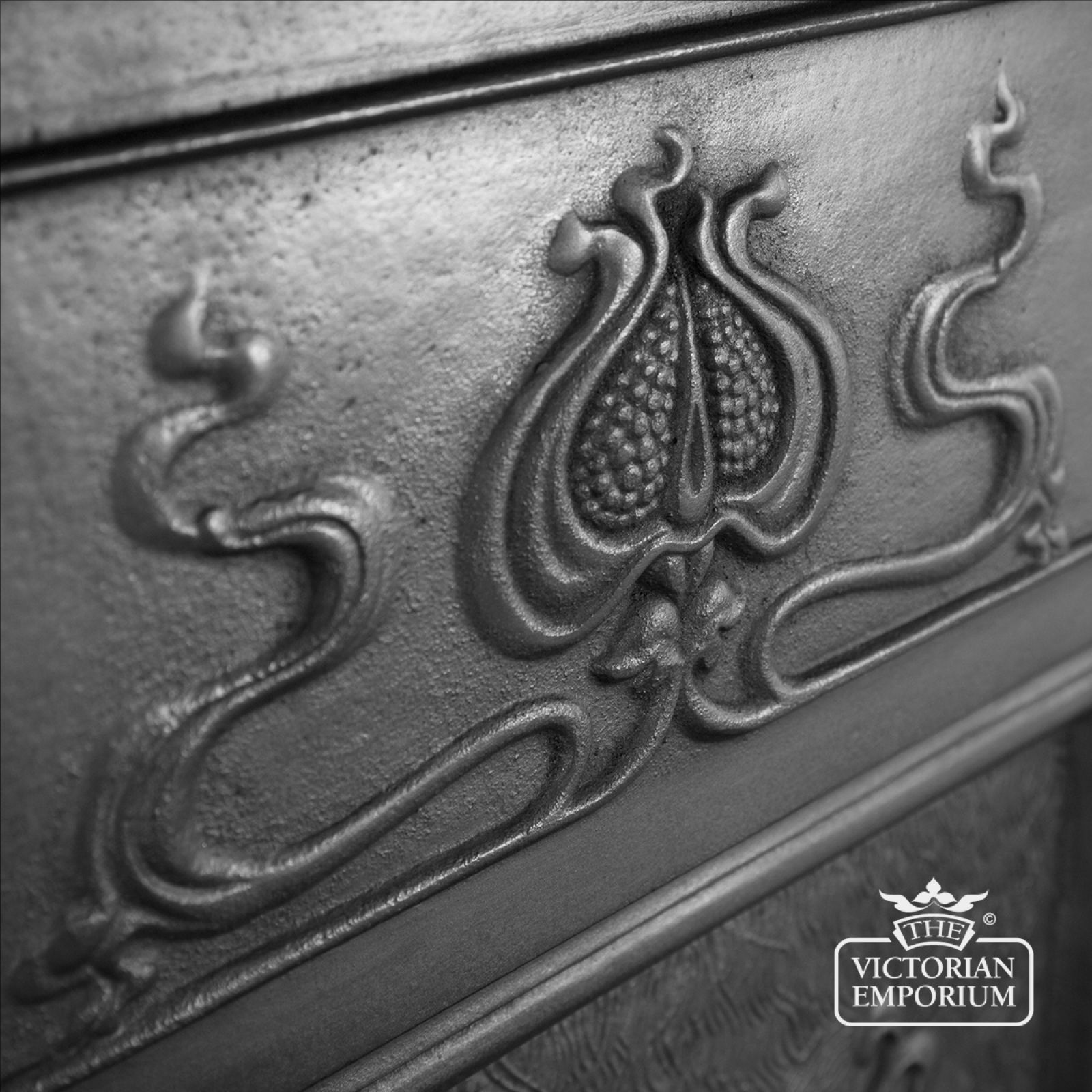 The Belle cast iron fireplace has an Art Nouveau style with stylised patterns running along the frame and canopy. This is also available in a smaller size. Ashpan black and polished finishes available.