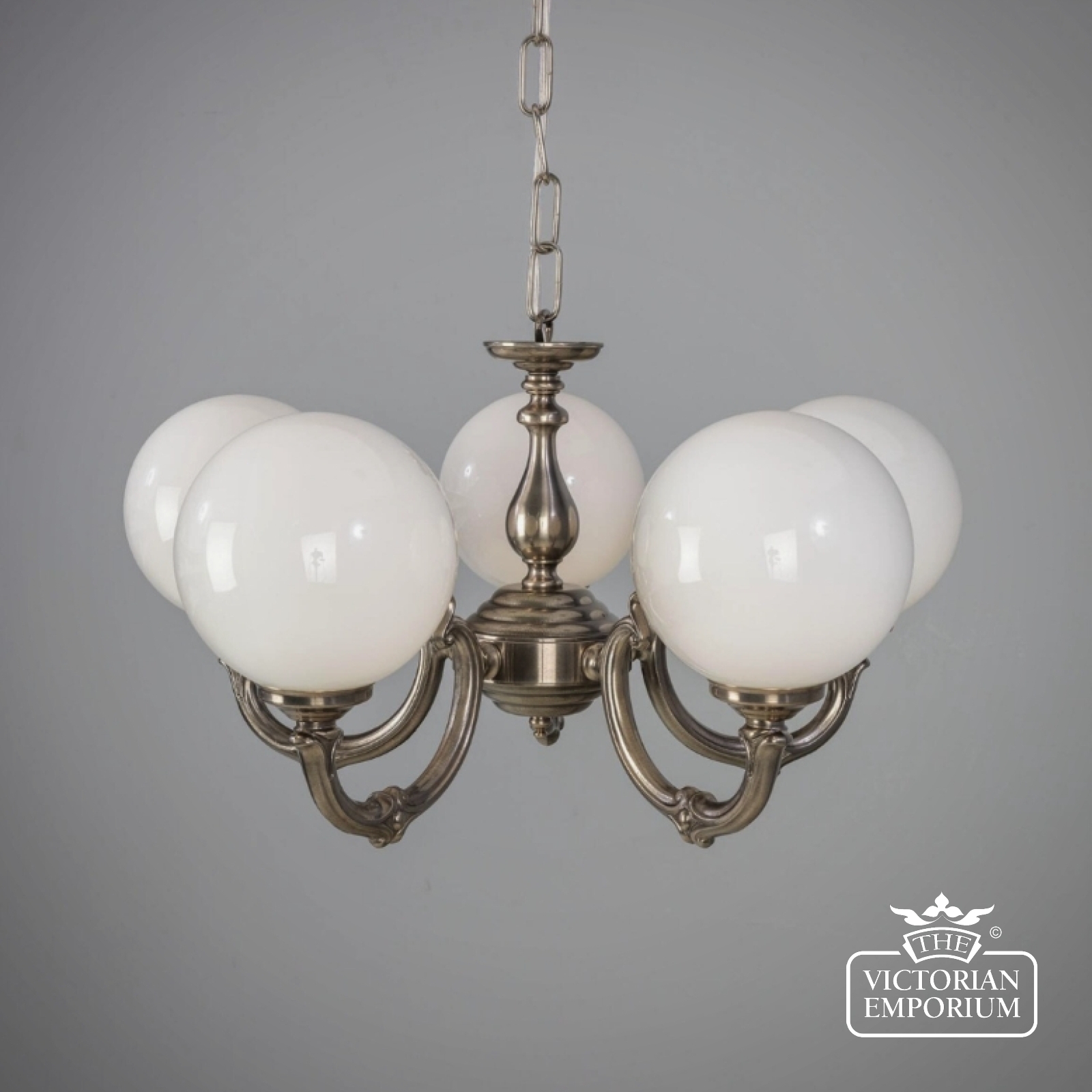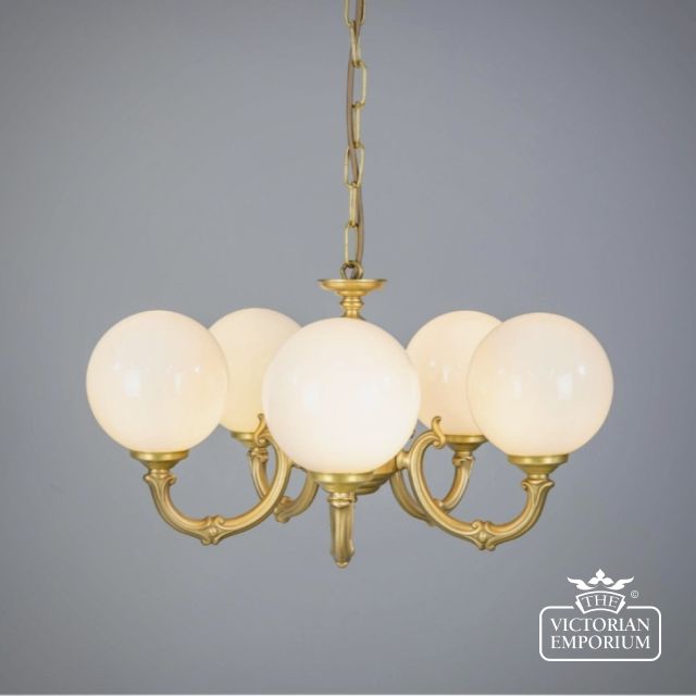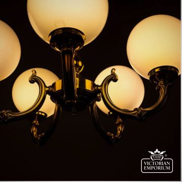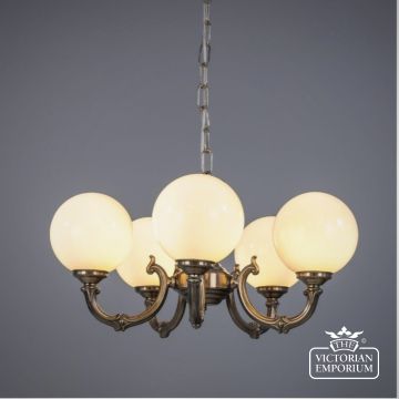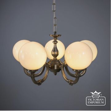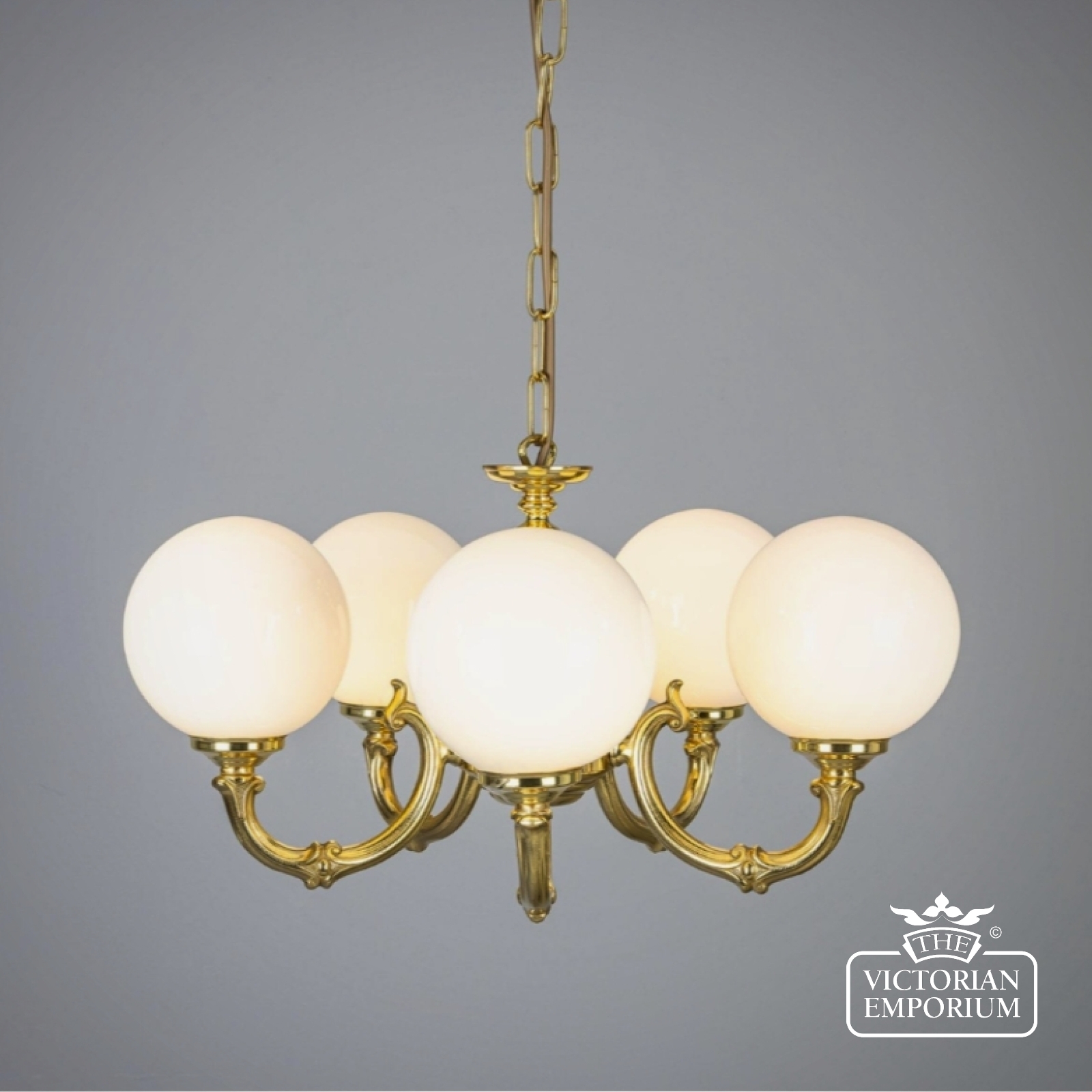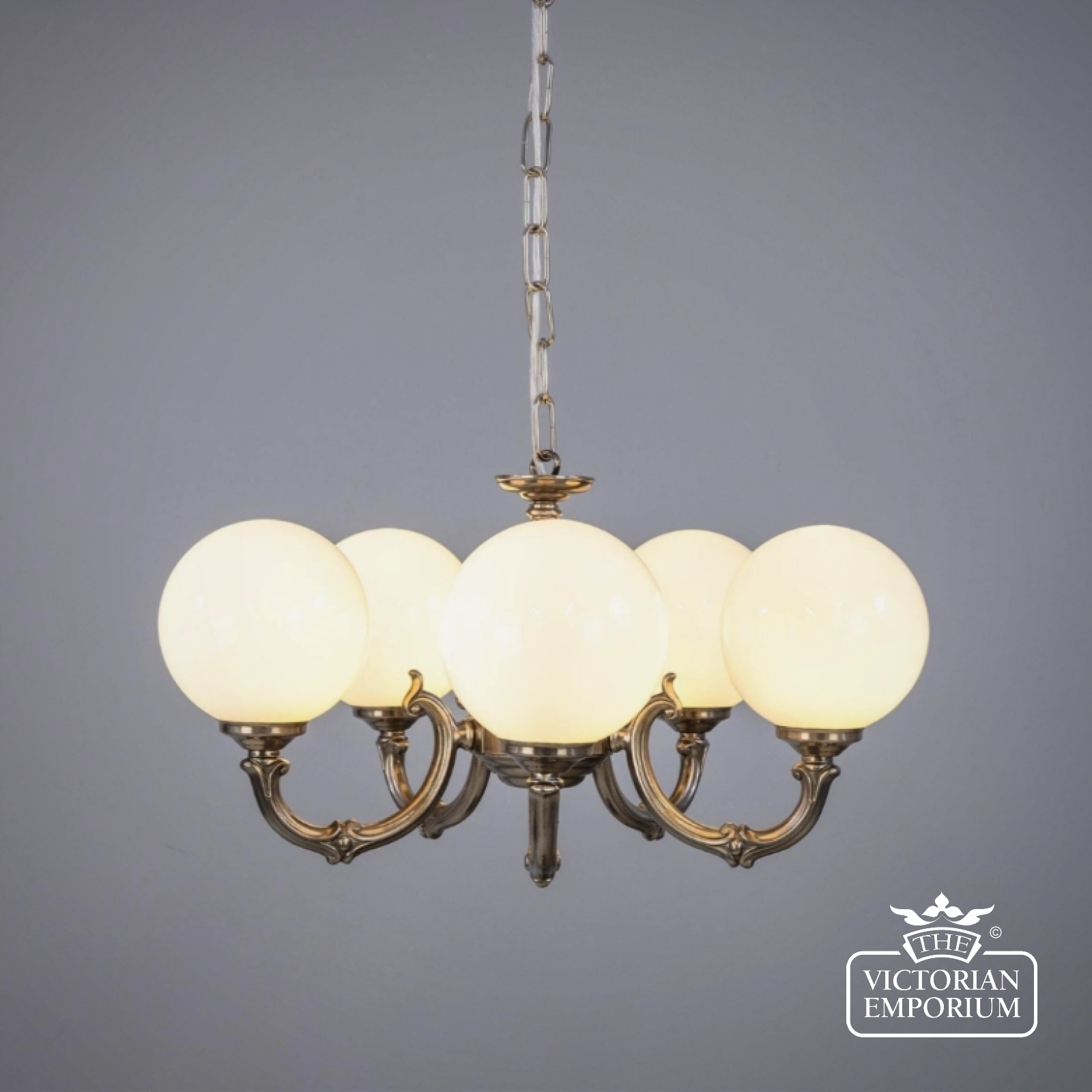 Bene Ornate Five-Arm Brass Chandelier with Opal Glass Globes