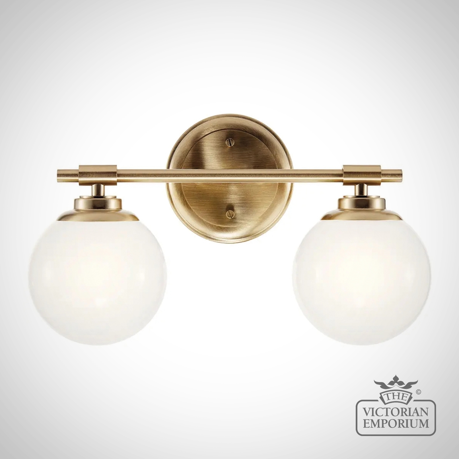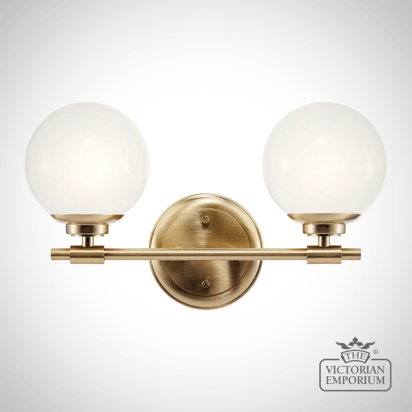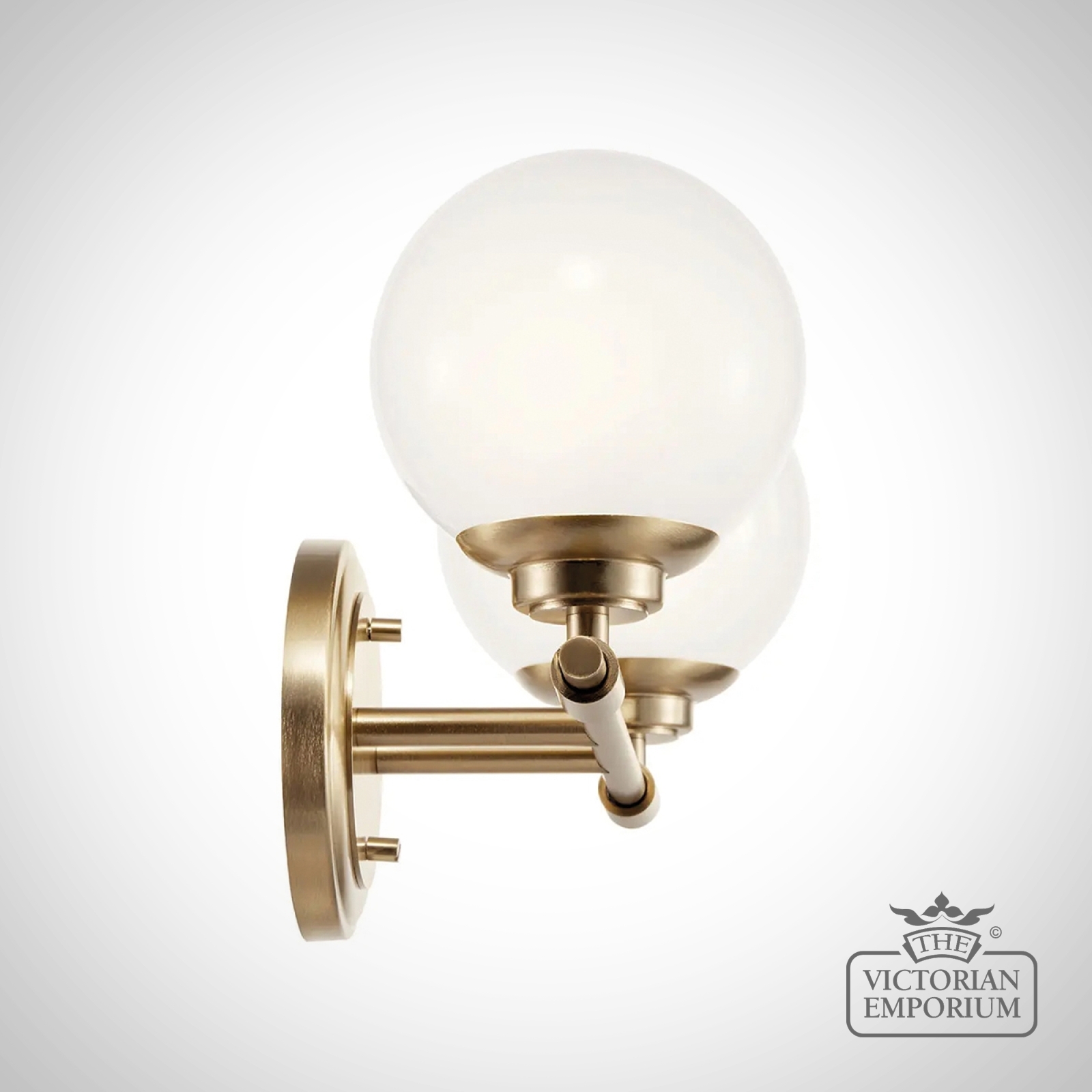 The Benno wall light features two classic globes in milky white opal glass and can be mounted facing up or down. Clean details highlight its mixed elegant finishes. IP44 rated for bathrooms.
